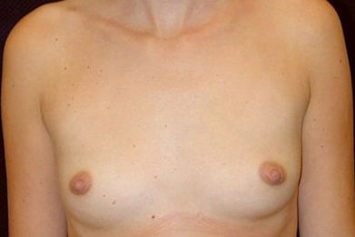 CASE DESCRIPTION: This is a 31-year-old, female resident of Napa, California who presented to the Novato office location in Marin County. She is 5 feet 5 inches tall and weighs 109 pounds. She underwent bilateral breast augmentation with 350 cc Mentor normal-saline breast implants inflated up to 420 ccs bilaterally. The approach was a peri-areolar incision and sub-muscular position of the breast implants. The procedure was performed at Marin Cosmetic Surgery Center in Marin County, California. She went from a size A to C+.