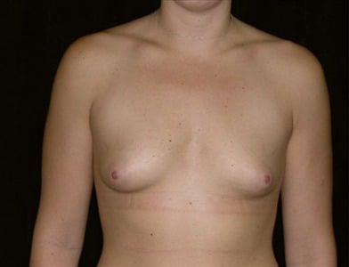CASE DESCRIPTION: This is a 26-year-old resident of San Francisco, California who presented to the San Francisco office at Union Square for evaluation for breast augmentation. She is 5 feet 11 inches tall and weighs 160 pounds. She underwent breast enlargement with Mentor normal-saline breast implants with a base size of 350 ccs inflated up to 410 ccs bilaterally. Her surgery was performed at Marin Cosmetic Surgery Center in Marin County, California. The approach was a peri-areolar incision with a sub-muscular position of the breast implants. She went from an A cup to a C cup.