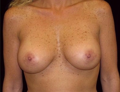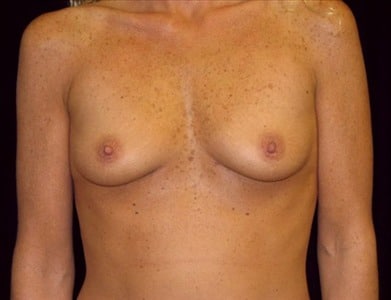 CASE DESCRIPTION: This is a 40-year-old, female resident of San Francisco, California who presented to the San Francisco office at Union Square for evaluation for breast enhancement. She is 5 feet 9 inches tall and 135 pounds. She has undergone bilateral breast augmentation using Mentor 425 ccs High Profile, silicone gel implants at Marin Cosmetic Surgery Center. She had a peri-areolar incision approach with a sub-muscular position for the silicone breast implants. She has gone from around an A cup to a C cup.