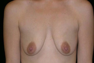 CASE DESCRIPTION: This is a 35-year-old, female resident of Santa Rosa, California. She presented to the Novato office in Marin County for an evaluation for breast enhancement. She is 5 feet 4 inches tall and weighs 109 pounds. She is the mother of two. She did not want the scars of a breast lift. She underwent a dual-plane breast augmentation using Mentor normal-saline breast implants. The base size was 325 ccs inflated up to 390 ccs bilaterally. The surgical approach was through a peri-areolar incision with sub muscular position of the implants in a dual-plane position. Her surgery was performed at Marin Cosmetic Surgery Center in Marin County, California. Her breast size went from a size B to a C+ cup size.