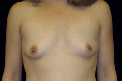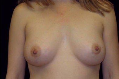 CASE DESCRIPTION: This is a 36-year-old, female resident of San Francisco who presented to the San Francisco office at Union Square for evaluation for breast enhancement. She is 5 feet 3 inches tall and 120 pounds. She is the mother of one child. She underwent bilateral breast augmentation using Mentor normal-saline breast implants with a base size of 300 ccs inflated up to 325 ccs bilaterally. The approach was a peri-areolar incision with sub muscular placement of the breast implants. The procedure was performed at Marin Cosmetic Surgery Center in Marin County, California. She went from a size A to a C-.