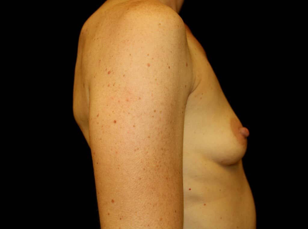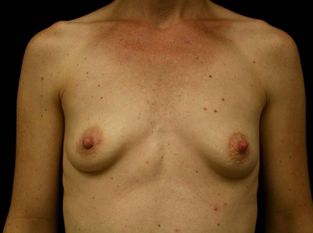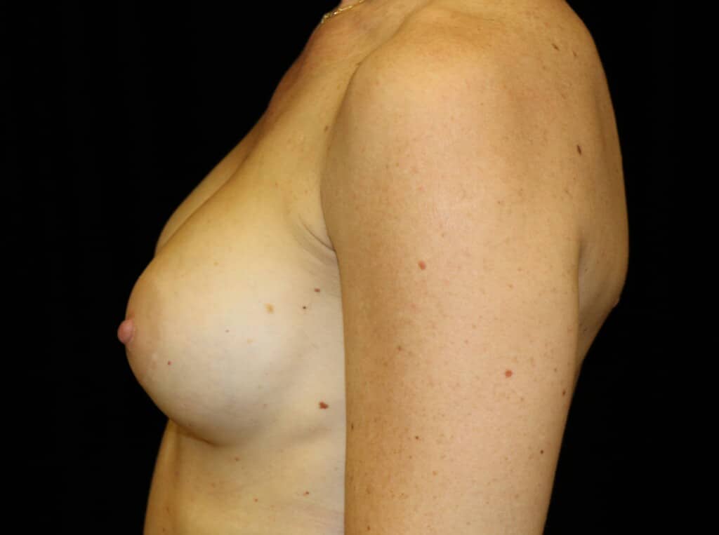 This is a 35 y.o. female 54? and 125 lbs who had breast augmentation through an areola incision with sub-muscular implant placement. The breast implants are 250ccs smooth silicone implants. She is seen 6 months after surgery. Her incision is well healed. Her cup size went from 32A to 32B+.