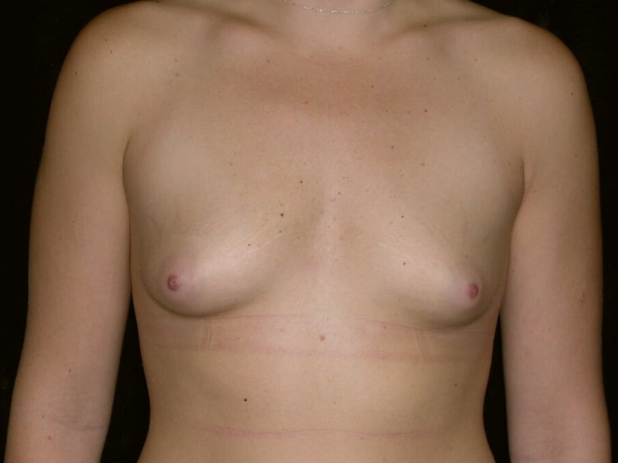 This is a 19 y.o. female 57? and 135 lbs who had breast augmentation through an areola incision with sub-muscular implant placement. The breast implants are 350ccs smooth silicone implants. She is seen 6 months after surgery. Her incision is well healed. Her cup size went from 32A+ to 32C+.
