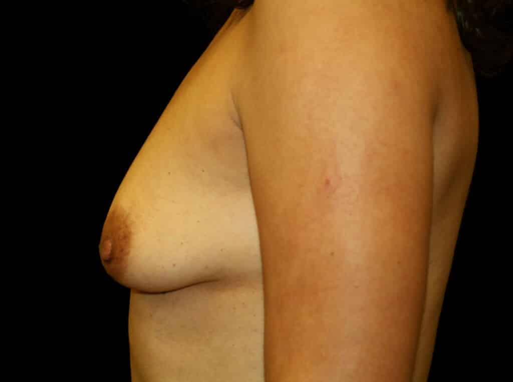 This is a 38 y.o. female 55? and 138 lbs with mild breast laxity. She had a duel-plane breast augmentation through an infra-mammary fold incision. The breast implants are 450ccs smooth round silicone implants. She is seen 8 months after surgery. Note that the skin laxity is at the limit before a breast lift would be required. If she had desired the breast mound to be higher and excepting of the additional incisions a breast lift would have been required. Her cup size went from 32B to 32C+.