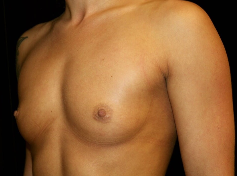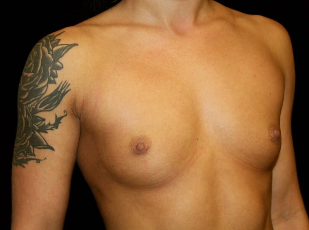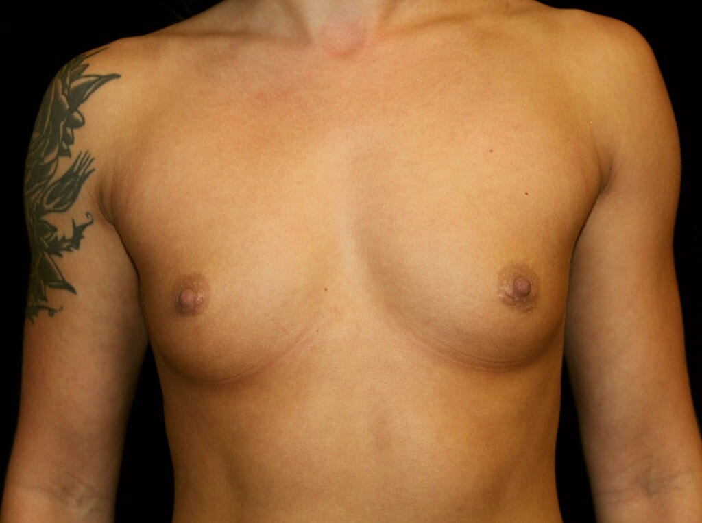 This is a 32 y.o. female 56? and 118 lbs who had breast augmentation through an areola incision with sub-muscular implant placement. The breast implants are 400 cc smooth round silicone implants. She is seen 10 months after surgery. Her incision is well healed. Her cup size went from 32A to 32D.