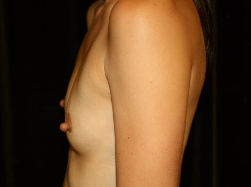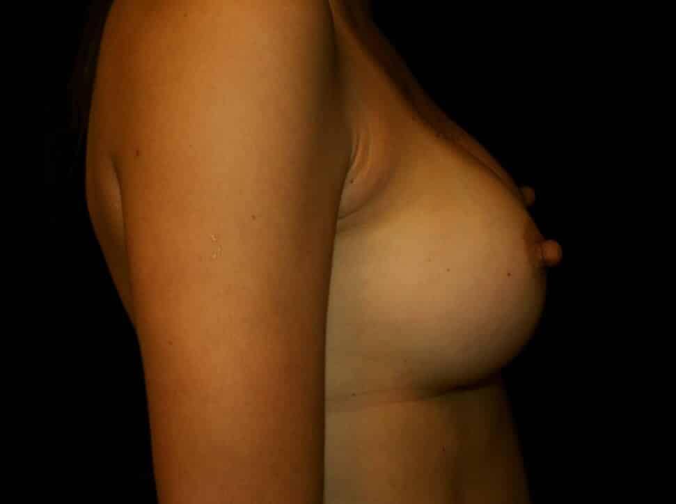 This is a 36 y.o. female 55? and 118 lbs who had breast augmentation through an infra-mammary fold incision with sub-muscular implant placement. The breast implants are 350 cc smooth round gummy bear silicone implants. She is seen 12 months after surgery. Note that a new fold has been created at the base, producing a roundness of the lower pole, more balance, and a natural look. Her cup size went from 34A to 34C+.