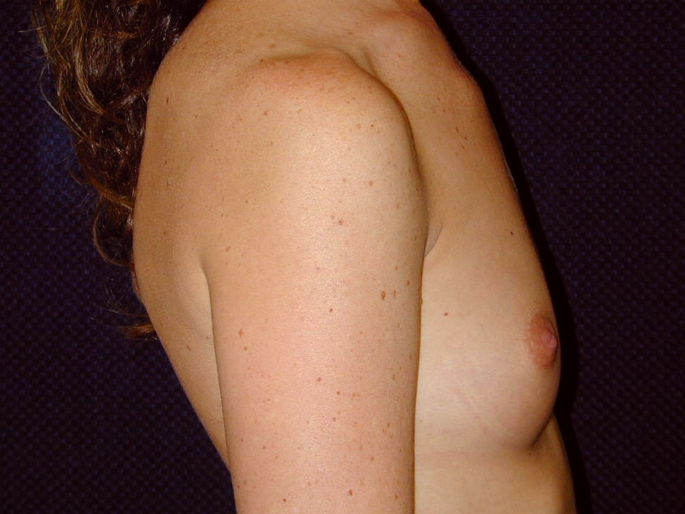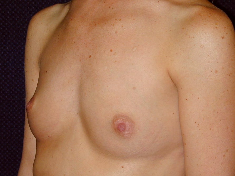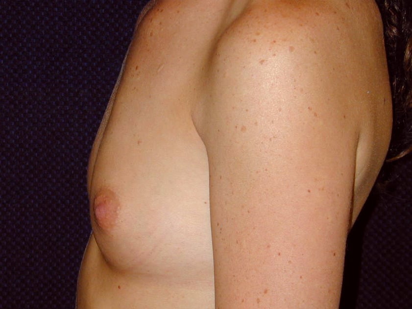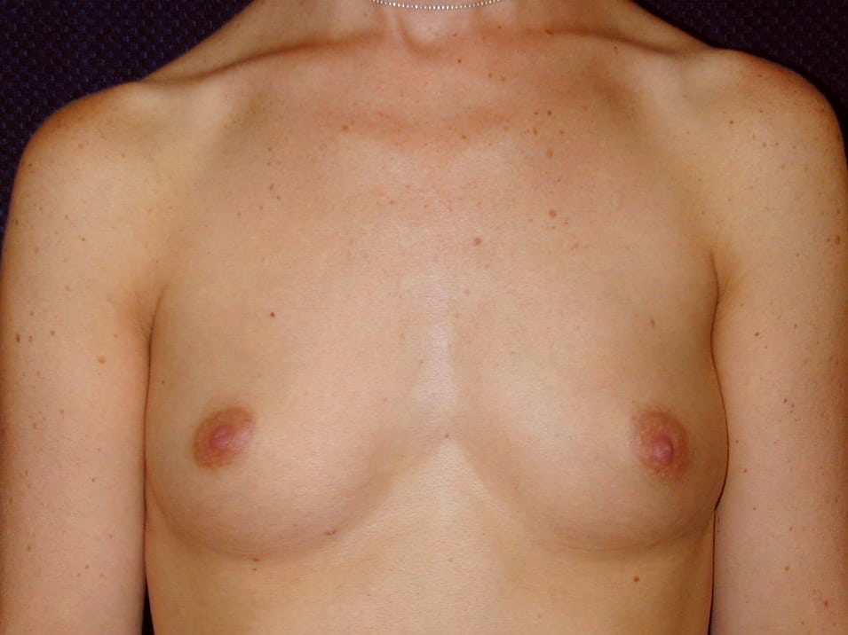This is a 21 y.o. female 55? and 118 lbs who had breast augmentation through an areola incision with sub-muscular implant placement. The breast implants are 400 cc smooth round silicone implants. She is seen 6 months after surgery. Her incision is well healed. Her cup size went from 36Ato 36D.