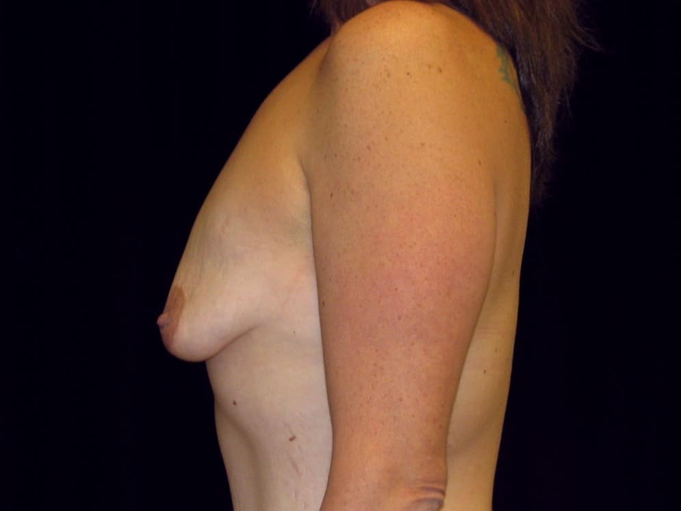 This is a 40 y.o. female 55? and 129 lbs who had breast augmentation through an areola incision with sub-muscular implant placement. The breast implants are 330 cc smooth round silicone implants. She is seen 5 months after surgery. Her incision is well healed. Note the barrel chest and how the implants improve the appearance and balance. Also observe the low position of the nipples and how the implant improved the overall breast asthetics. Her cup size went from 36A+ to 36C+.