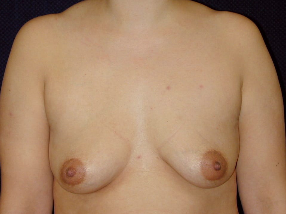 This is a 26 y.o. female 54? and 130 lbs who had breast augmentation through an areola incision with sub-muscular implant placement. The breast implants are 375 cc smooth round silicone implants. She is seen 8 months after surgery. Her incision is healing well. Her cup size went from 38B to 38D.