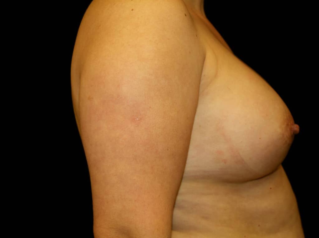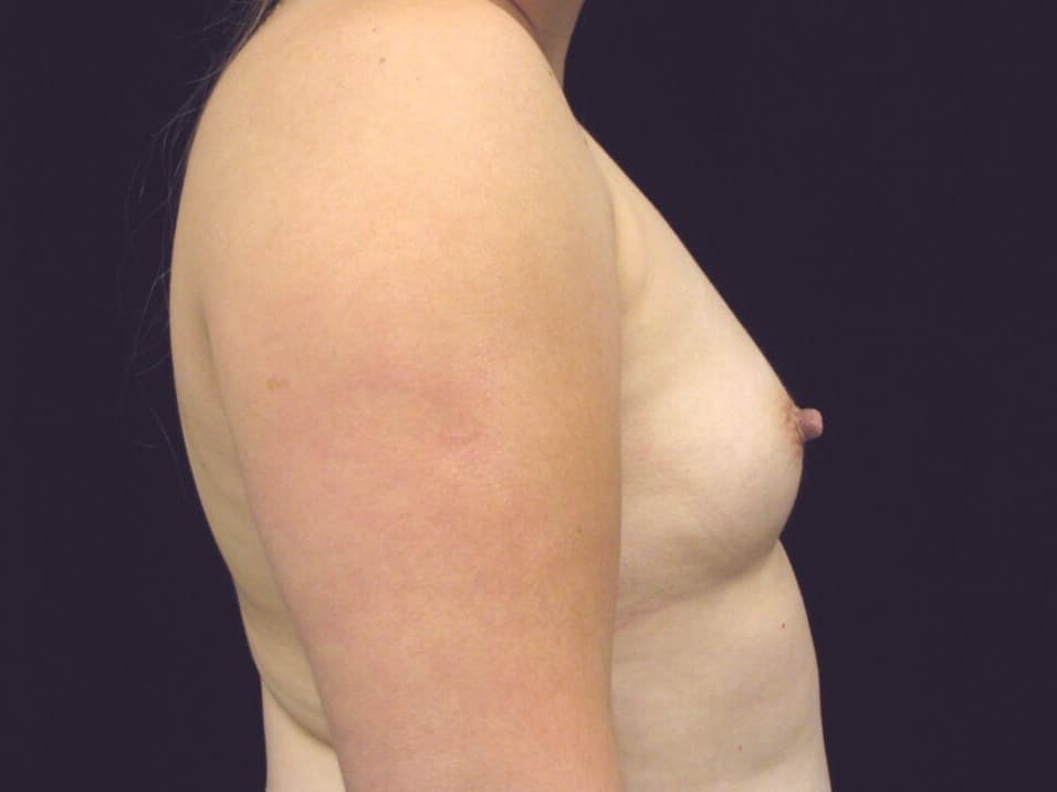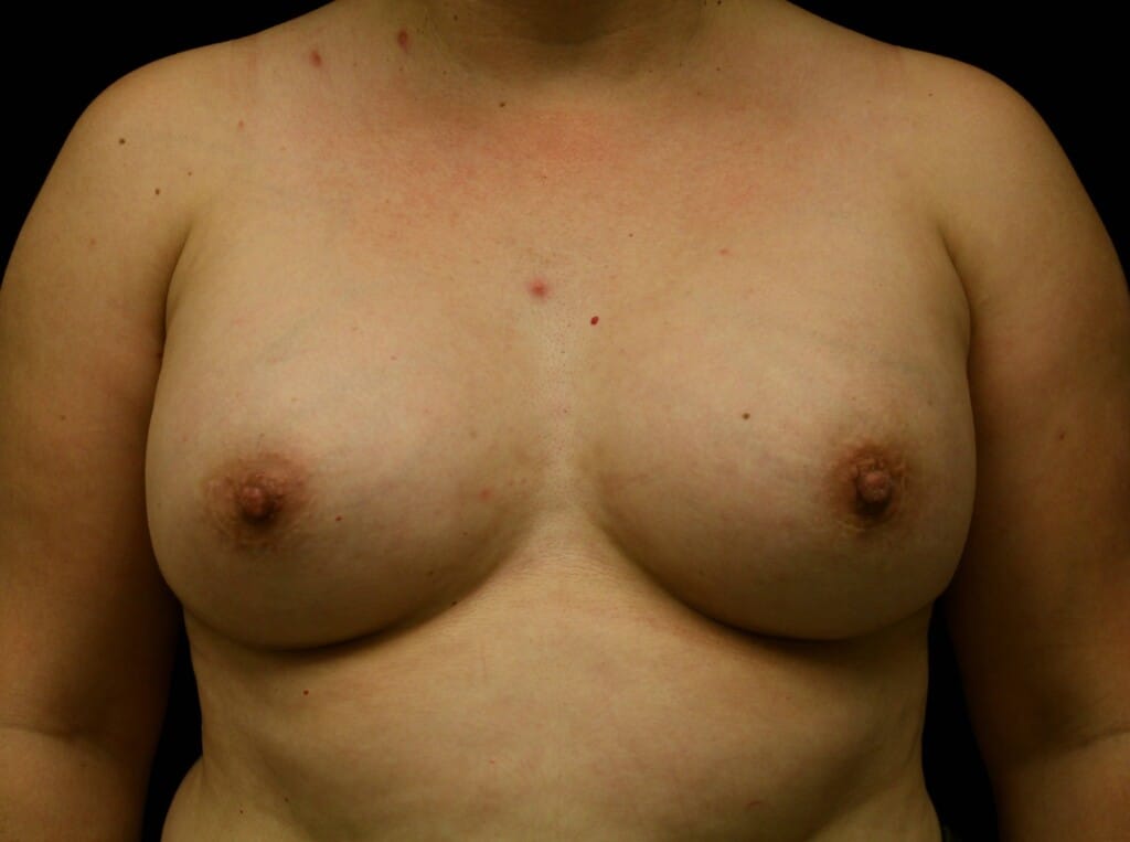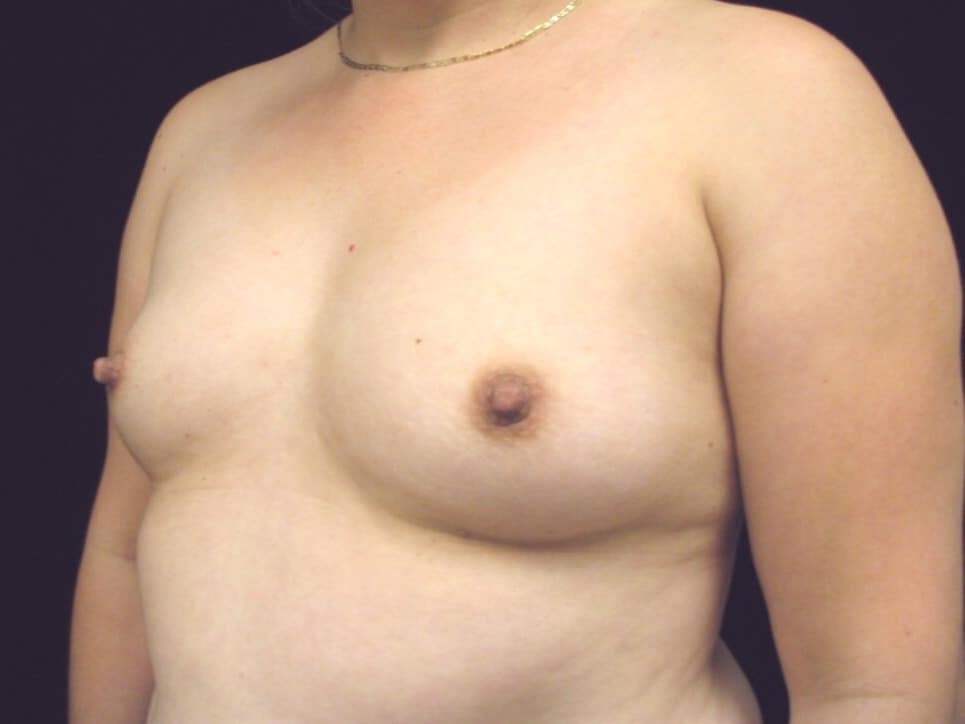 This is a 32 y.o. female 57? and 145 lbs who had breast augmentation through an infra-mammary fold incision with sub-muscular implant placement. The breast implants are 500 cc on the right and 450 on the left. The implants have a different profile and are smooth round gummy bear silicone implants. She is seen 8 months after surgery. Her cup size went from 38A/B to 38DD.