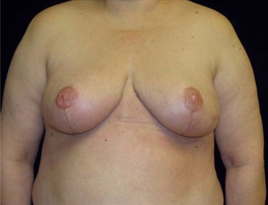 CASE DESCRIPTION: This is a 45-year-old San Francisco resident seen in the San Francisco office. She is 5 feet 5 inches, 220 pounds, with size GGG breasts. She underwent an inverted T free nipple breast reduction due to the extreme size of her breasts. She is seen four months after surgery with early healing, but note the nice size and shape of her breasts. She went from GGG to a D cup.