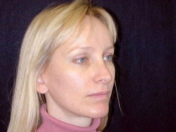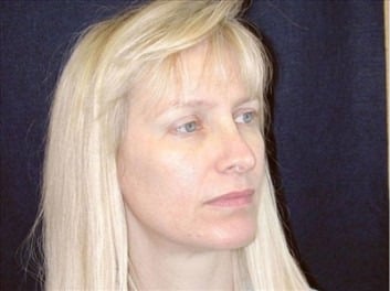 CASE DESCRIPTION: This is a 43-year-old, San Francisco, California resident who presented to the San Francisco office at Union Square for evaluation of the upper face location. She underwent an endoscopic brow lift and a mini-facelift. She has had two children. Her brows were raised 5 millimeters on the right and 7 millimeters on her left side. She had a strong lateral pull on the lateral tips of the brows and the central corrugators were released as well. The corrugators are the muscles that cause the frown between the eyebrows. The procedure was performed at the Marin Cosmetic Surgery Center in Marin County, California. Note the nice, natural and well-balanced appearance.