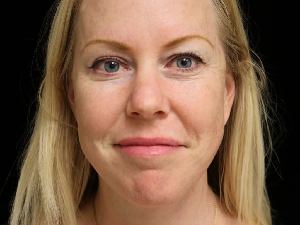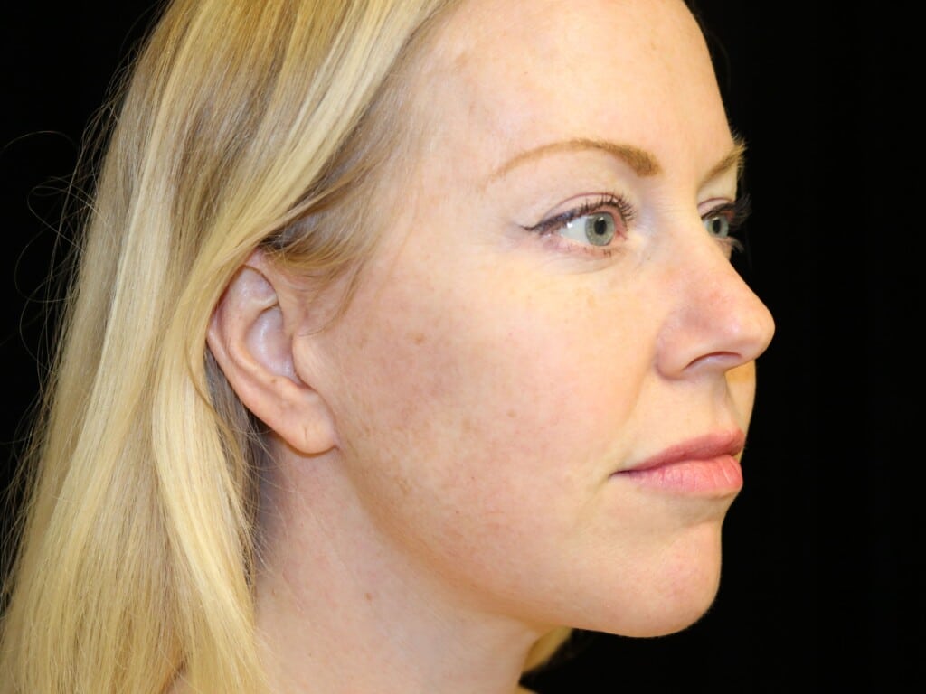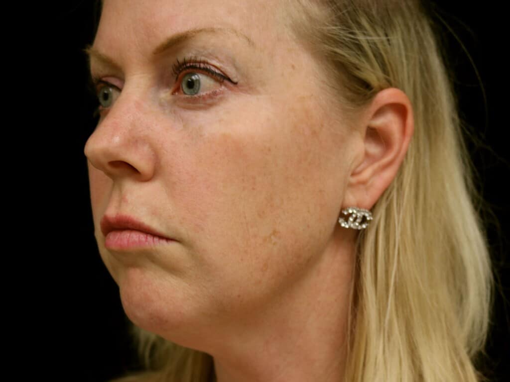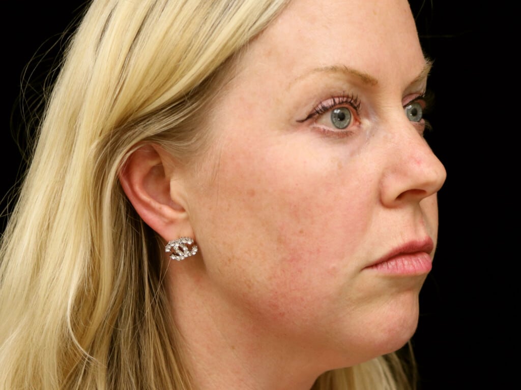 This is a 46 y.o. female who complains that her neck looks like her mothers. She doesnt like the jowls or the redundant neck skin and fat. She had a modern-day SMAS facelift which includes the mid-face, jowls, and neck rejuvenation. She has also had a chin implant. She is seen 8 months after surgery.