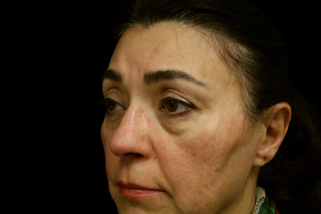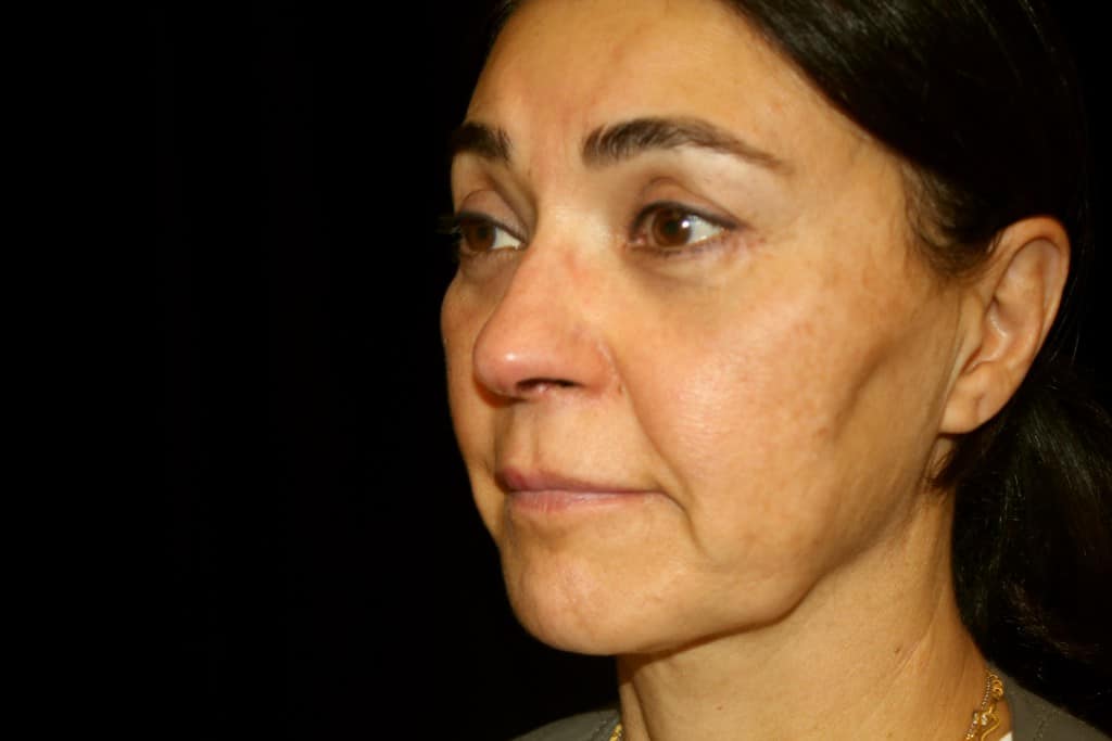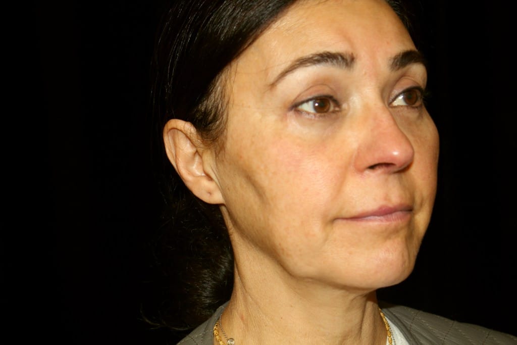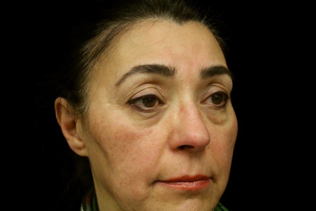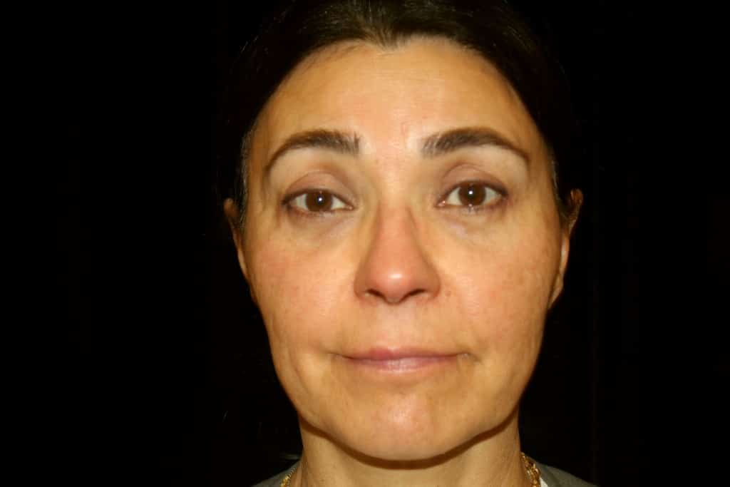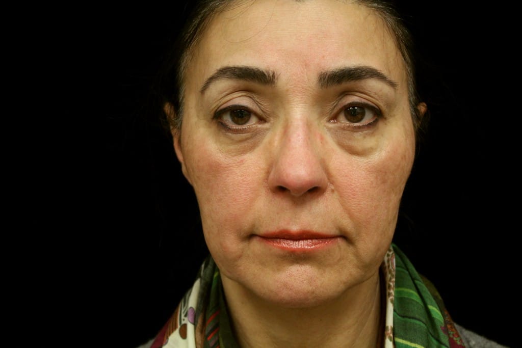 This is a 57 year old female who presents with the aging face and presents for a quad Blepharoplasty, a temporal brow lift and corrugator resection. She is mostly concerned about the upper facial aging