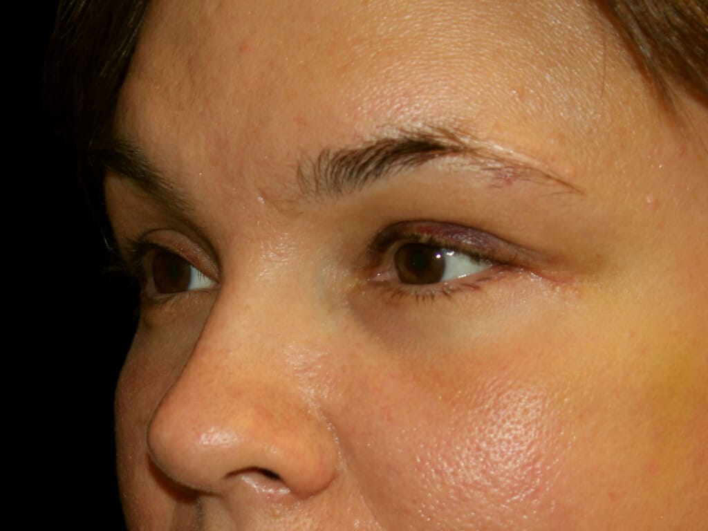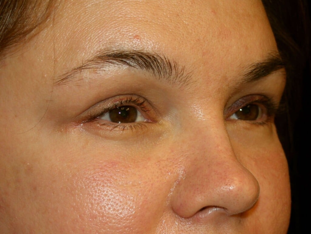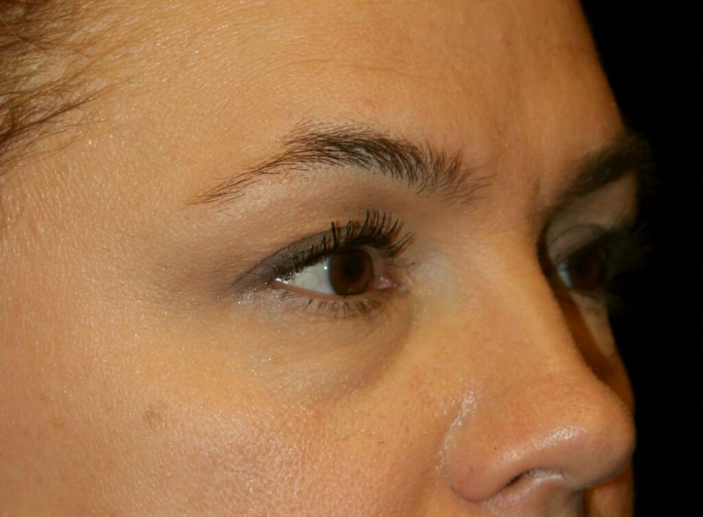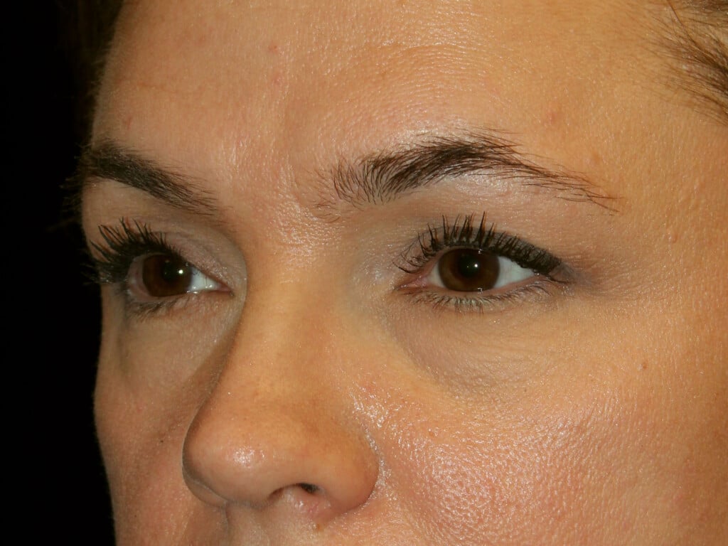 Case Description: This is a 47 y.o. female who complains of loss of her upper eyelid show and fullness in the lower eyelids. She had an upper and lower eyelid lift or blepharoplasty. Her incision was made just below the eyelash line in the lower eyelid. Her photos are taken 6 months after surgery.