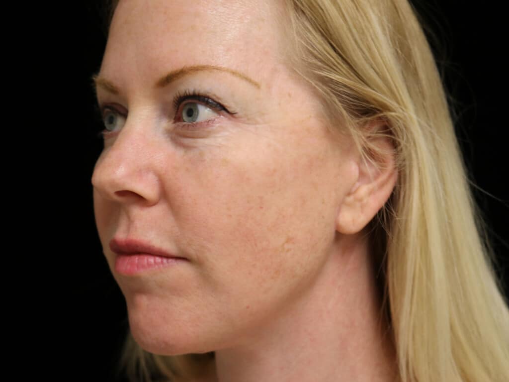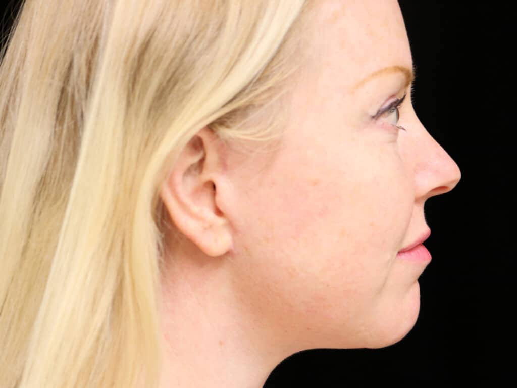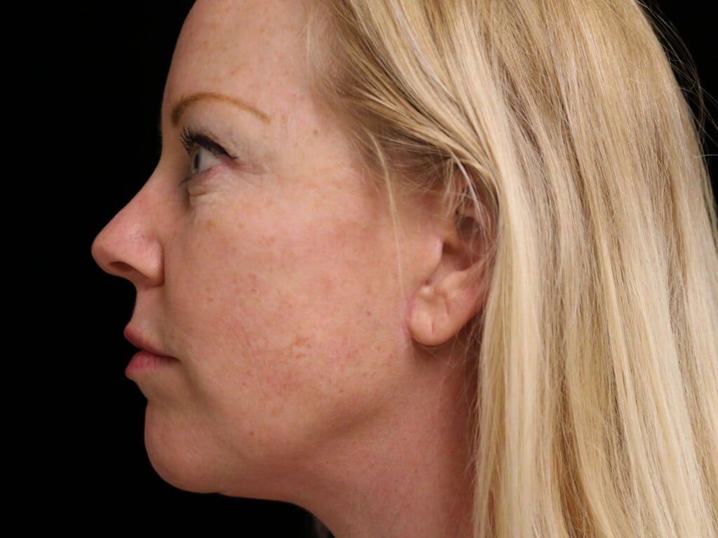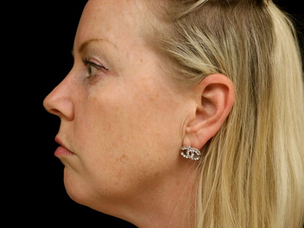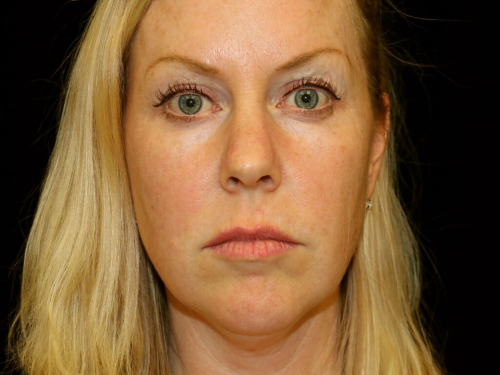 This is a 46 y.o. female who complains that her neck looks like her mothers. She doesnt like the jowls or the redundant neck skin and fat. She had a modern-day SMAS facelift which includes the mid-face, jowls, and neck rejuvenation. She has also had a chin implant. She is seen 8 months after surgery.