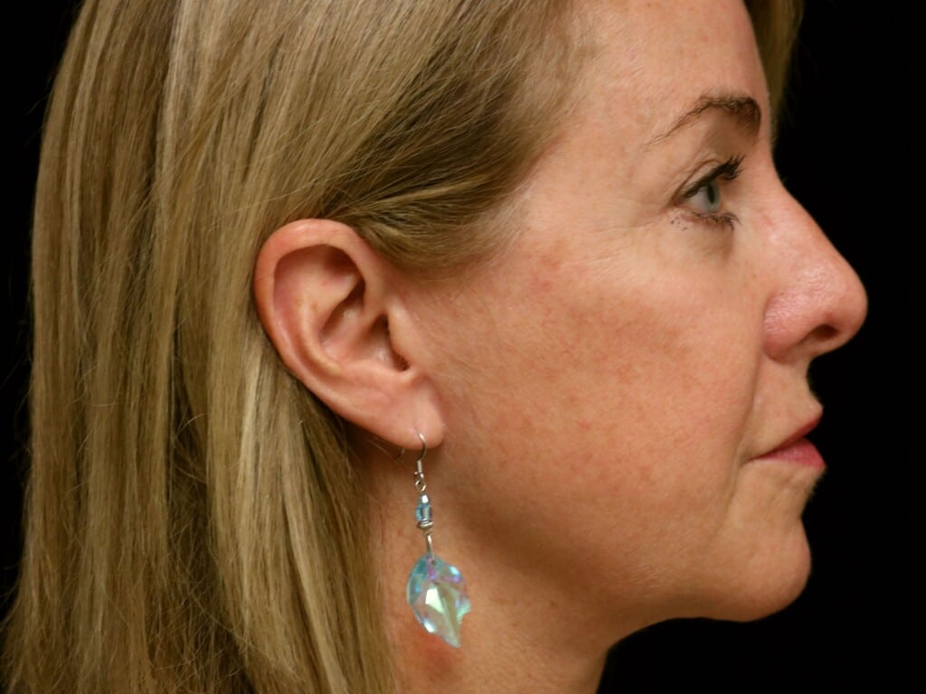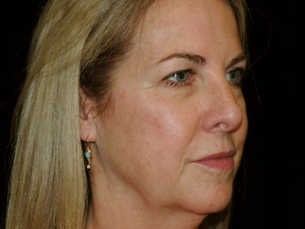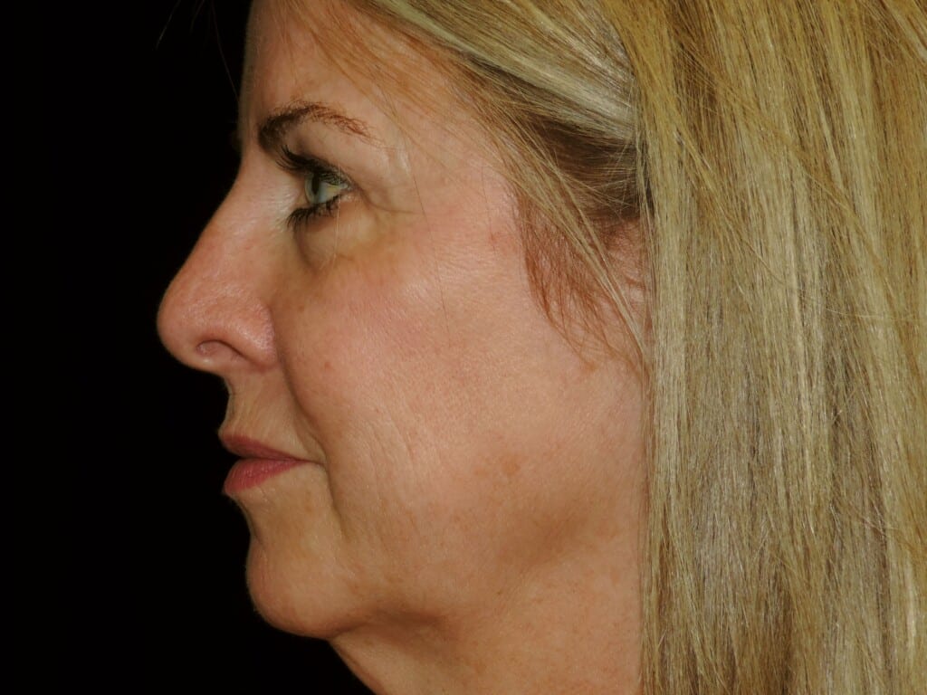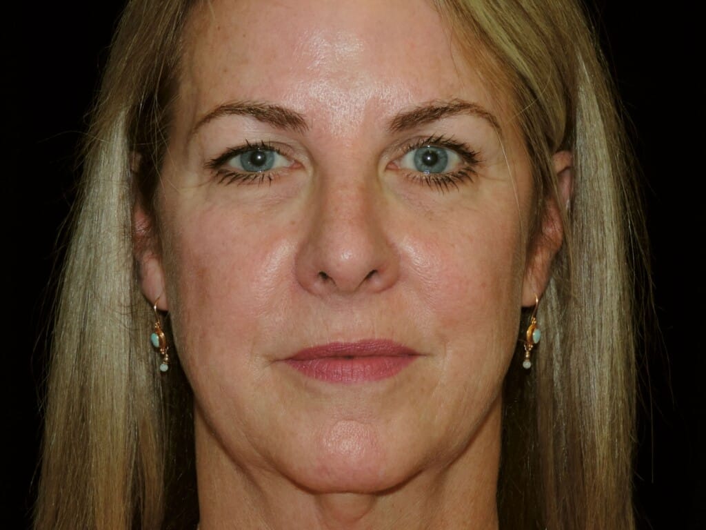 This is a 55 y. o. female who presents for facial rejuvenation. She had a modern-day SMAS facelift which includes the mid-face, jowls, and neck rejuvenation. In addition, she had an endoscopic browlift and a chin implant. She is seen 7 months after surgery.