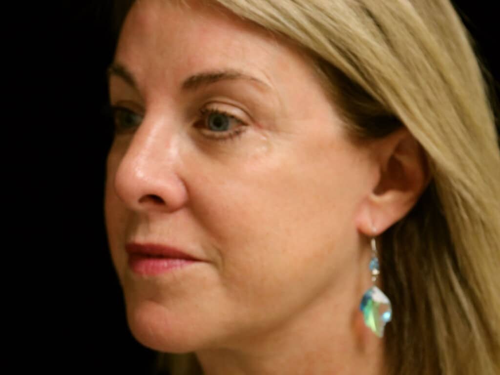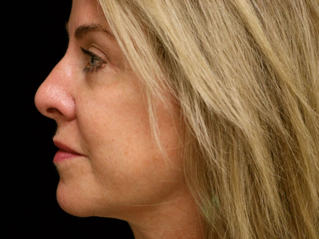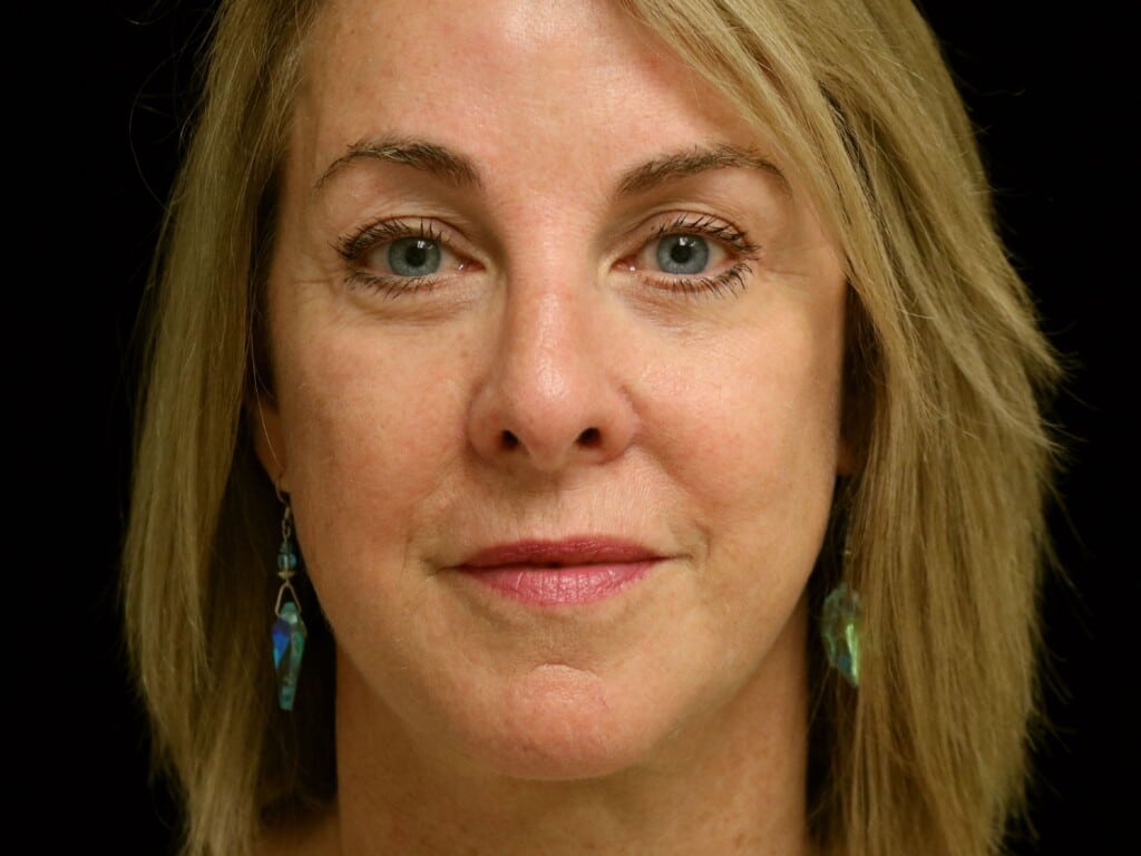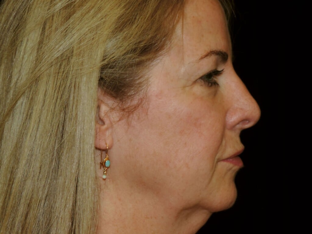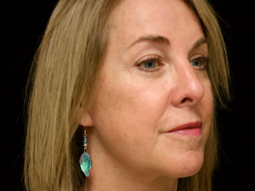 This is a 55 y. o. female who presents for facial rejuvenation. She had a modern-day SMAS facelift which includes the mid-face, jowls, and neck rejuvenation. In addition, she had an endoscopic browlift and a chin implant. She is seen 7 months after surgery.