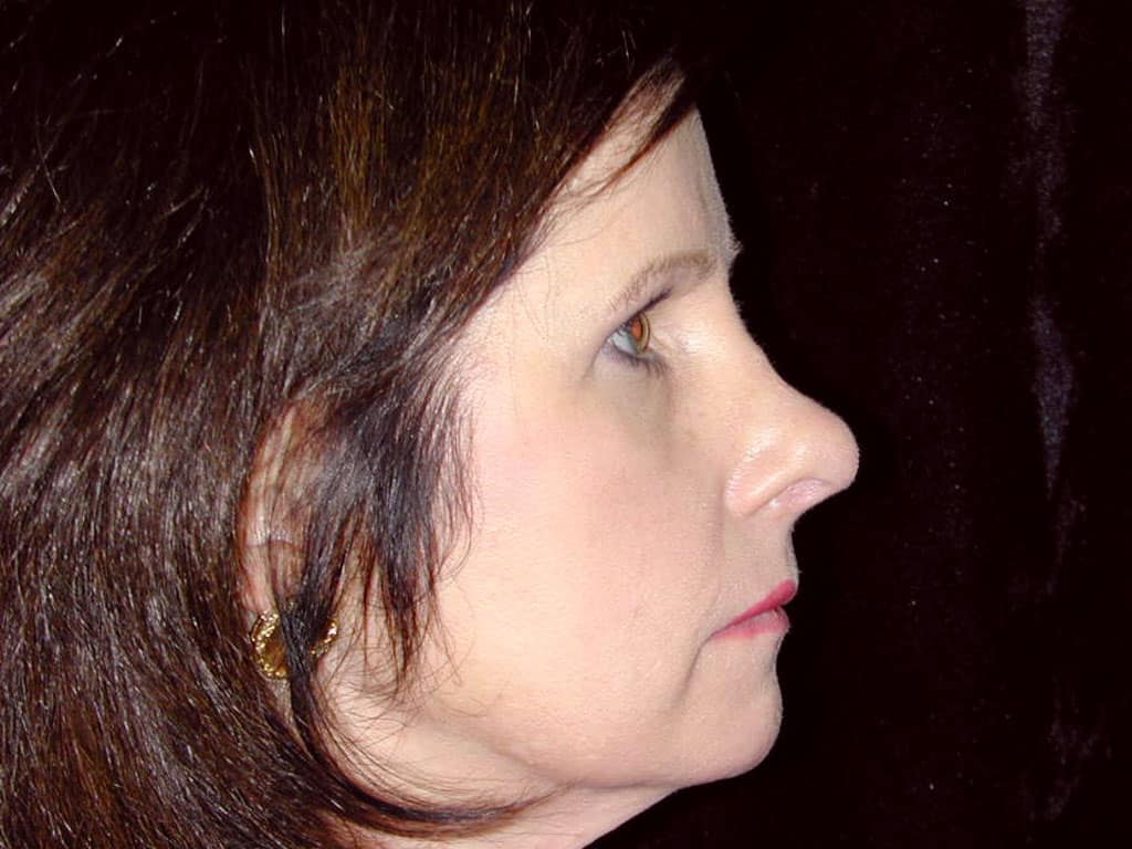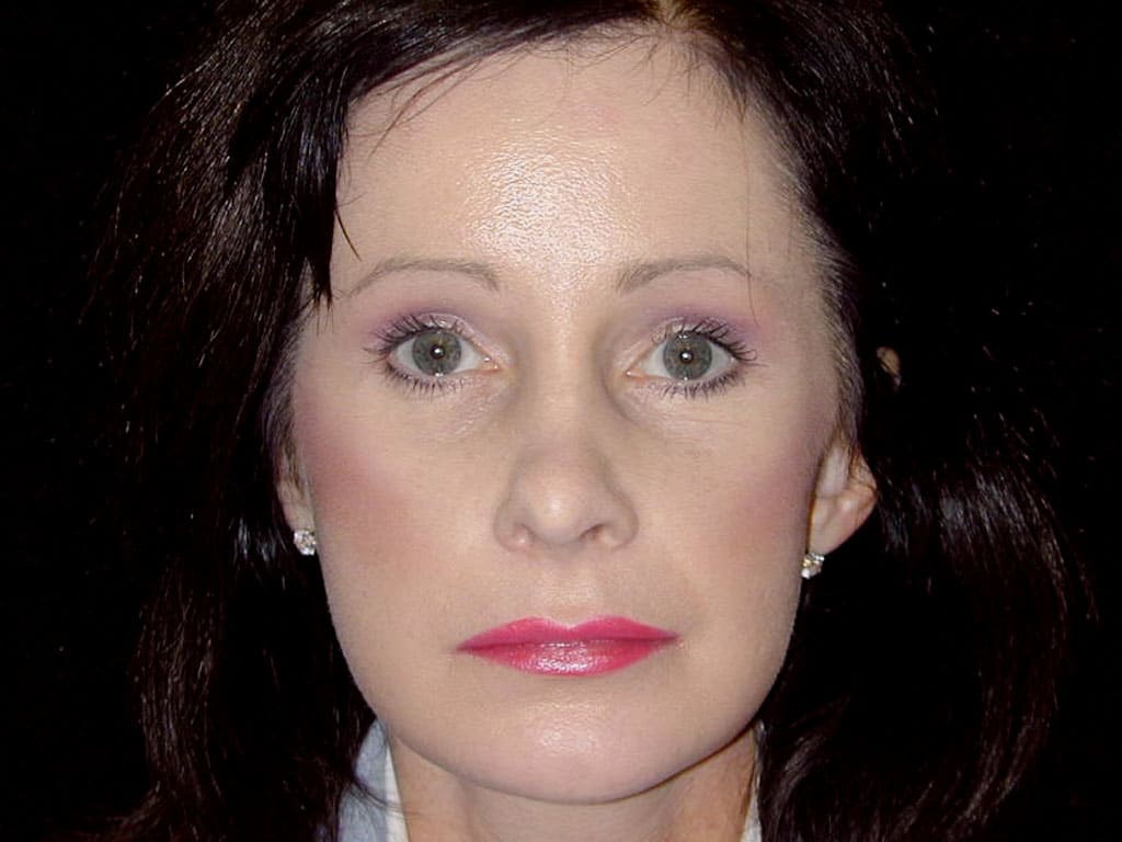 This is a 56 y.o. female who wants to rid the angry look she displays in the upper face. She had a modern-day SMAS facelift which includes the mid-face, jowls, and neck rejuvenation. In addition, she had an upper and lower eyelid lift (blepharoplasty), an endoscopic brow lift, and a chin implant. She is seen 6 months after surgery.
