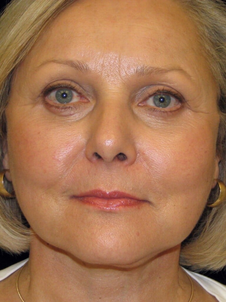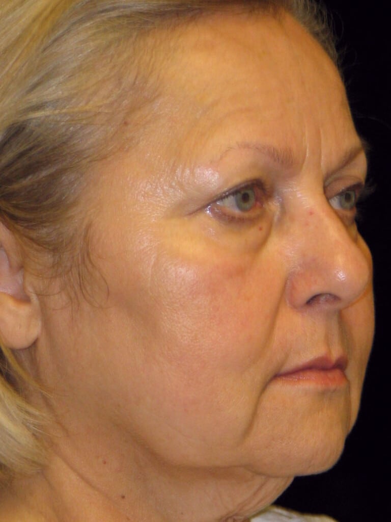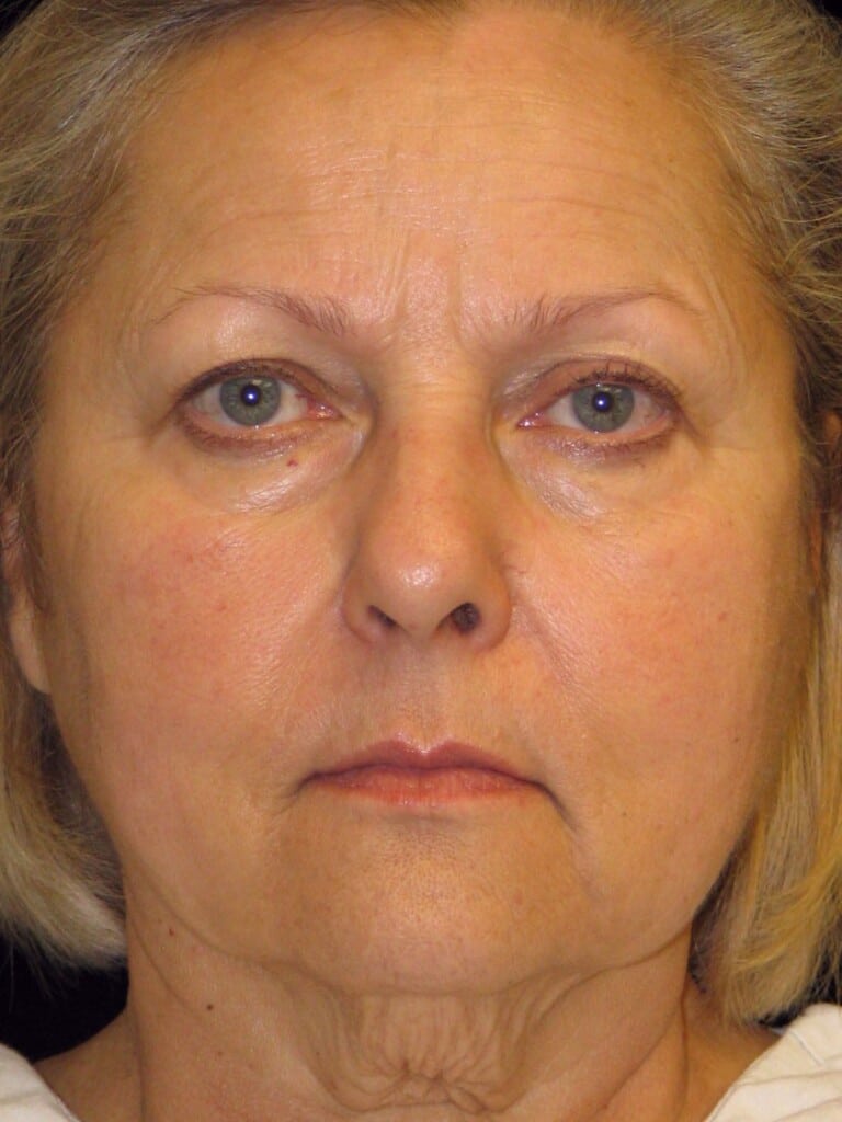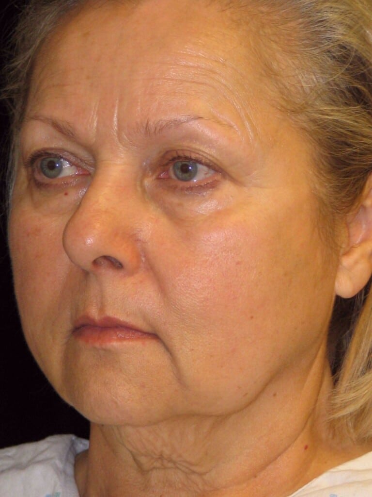 This is a 62 y. o. female who presents with the aging face. Her concern is the aging around her eyes and jowls. She had a modern-day SMAS facelift which includes the mid-face, jowl, and neck rejuvenation. In addition, she had an upper and lower eyelid lift (blepharoplasty), fat injection, chin augmentation, and a TCA chemical peel. She is seen 4 months after surgery.