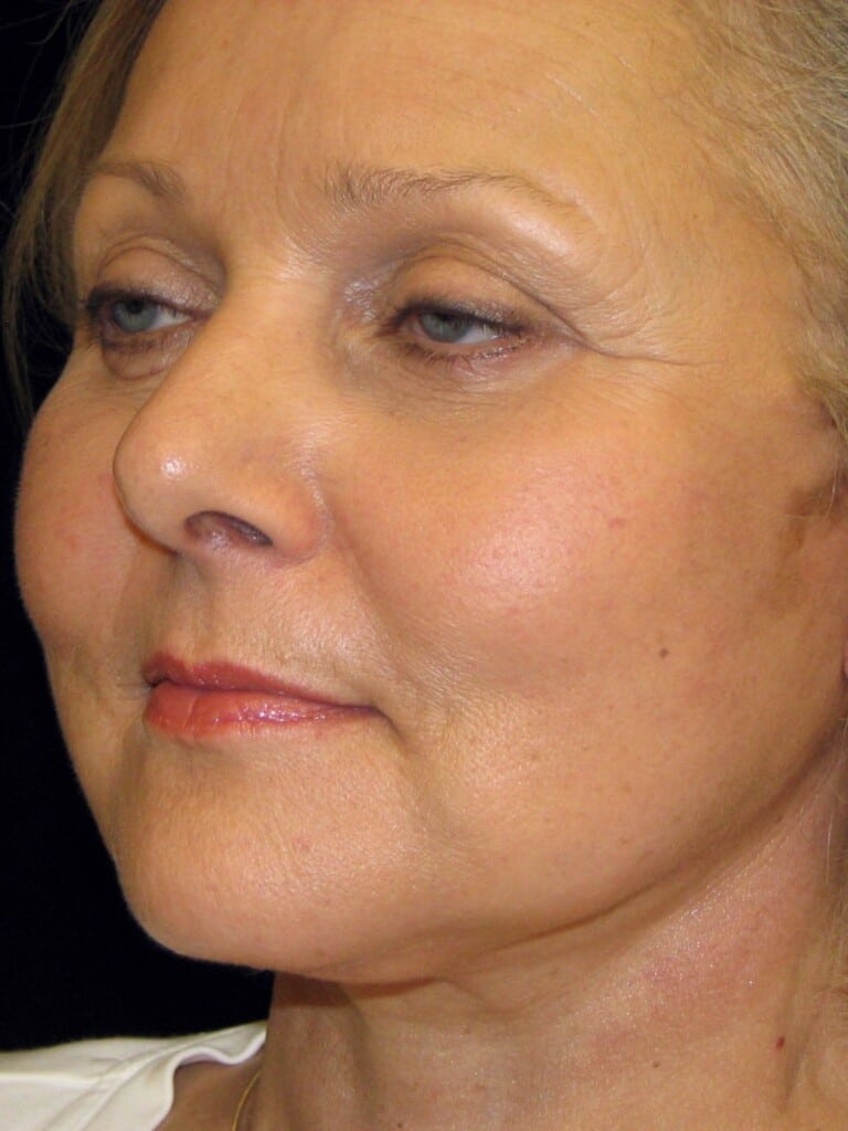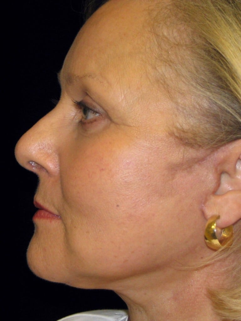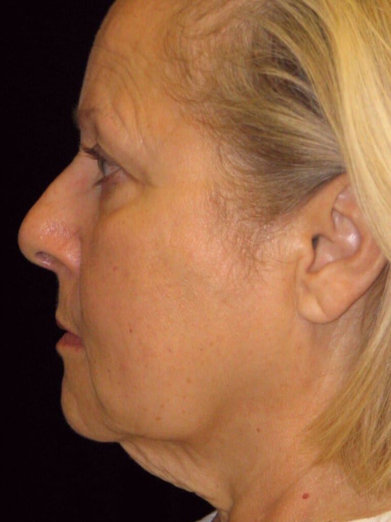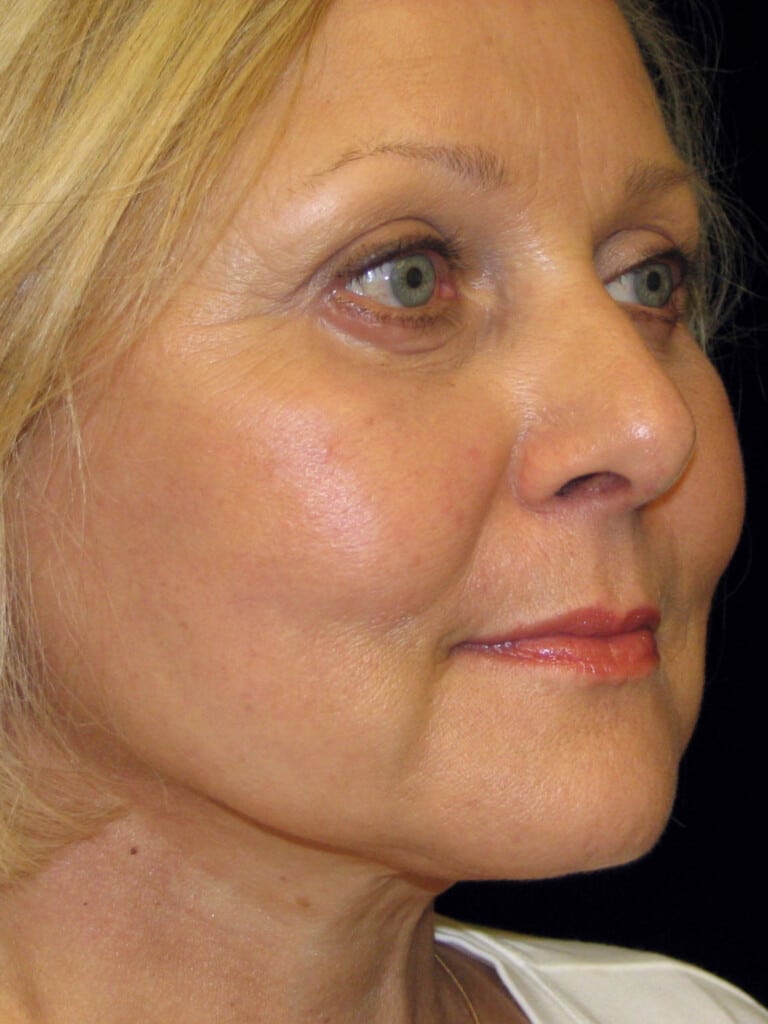 This is a 62 y. o. female who presents with the aging face. Her concern is the aging around her eyes and jowls. She had a modern-day SMAS facelift which includes the mid-face, jowl, and neck rejuvenation. In addition, she had an upper and lower eyelid lift (blepharoplasty), fat injection, chin augmentation, and a TCA chemical peel. She is seen 4 months after surgery.