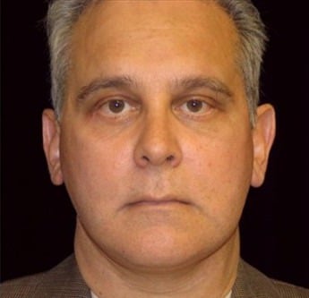 CASE DESCRIPTION: This is a 54-year-old, male resident of San Francisco who presented to the San Francisco office at Union Square for evaluation of his aging face. He underwent an eyebrow lift and lower lid eyelid lift with a lower facelift. He had buccal fat excision, or cheek fat excision, of his cheeks and he also had 7 cc of fat injected into his right and left upper cheek. He underwent a prejowl chin implant. His goal was to have an overall more youthful appearance. The lower facelift included a SMASectomy excision, which is excision of the deep tissue to thin his face as opposed to a SMAS plication, which would give more volume to his face. He had liposuction in the jowl region and a complete platysma transection in his neck. He had the eyebrow lift with 11-millimeter elevation bilaterally. His procedure was performed at Marin Cosmetic Surgery Center in Marin County, California. Note the herniated cheek fat that has caused a significant fullness in the jowl location.