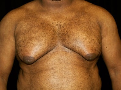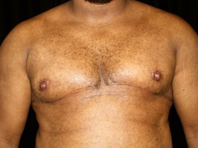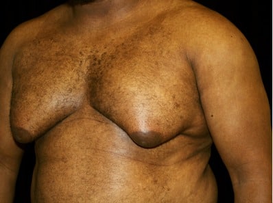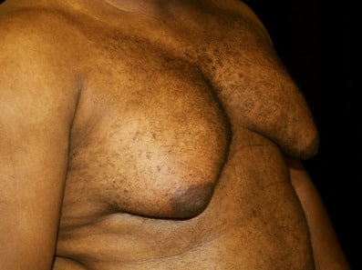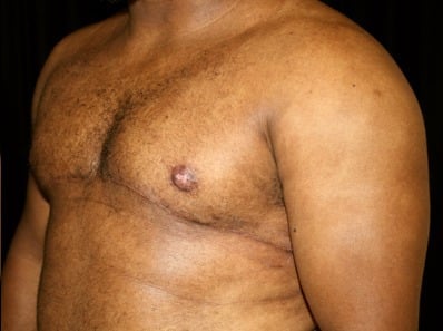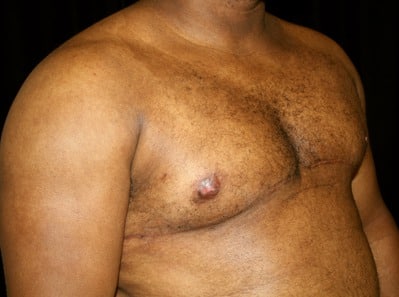 This is a 31-year-old male with grade 4 severe gynecomastia who presents for free nipple mastectomy of his gynecomastia tissue and fat. Due to the laxity of his skin and the amount of tissue it was elected to do a one stage procedure instead of a two stage gyno male breast reduction surgery. He underwent free nipple mastectomy with removal of a large amount of tissue on both his right and left side. We extracted about 1600 cc of fat and aspirate in addition from the abdomen and he also had flank liposuction. His photographs are seen approximately six weeks after surgery.