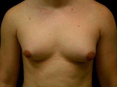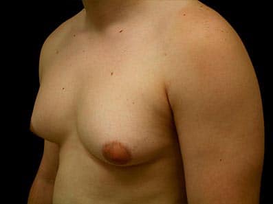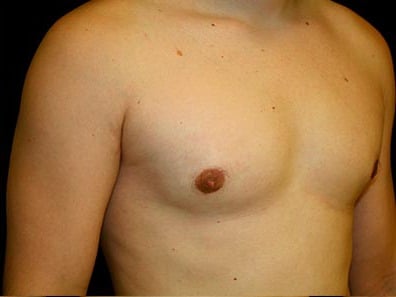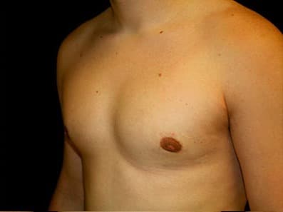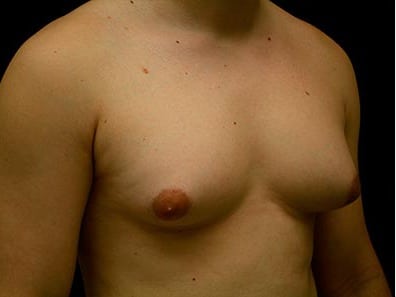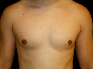 This is a 21-year-old male from Brentwood, California, who presents for male breast reduction for gynecomastia. He underwent gland excision and suction-assisted lipectomy of his chest and had 44 grams of tissue removed from his right side and 120 grams removed from his left side. He had adolescent gynecomastia, and he also has had some pro-hormones in the past. His overall goal is to be able to wear a light t-shirt. His photographs are taken approximately three months after surgery.