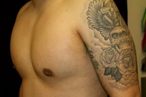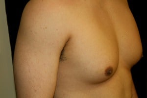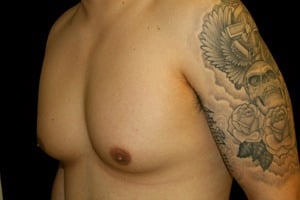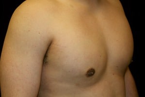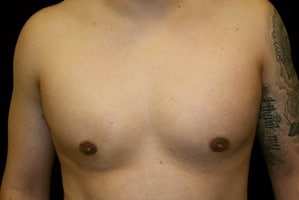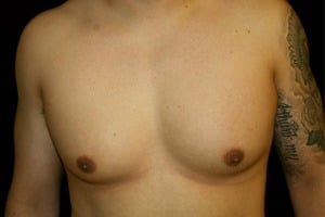 This is a 25-year- old male from Geyserville, California, who presents with adolescent gynecomastia. He underwent gynecomastia surgery at Marin Cosmetic Surgery Center in which he had 71 grams of tissue removed from his right chest and 41 grams from his left chest. His postoperative pictures are seen approximately two months after surgery. His overall goal was to have a flat chest with a natural appearance.