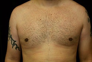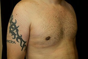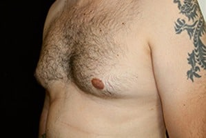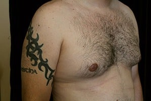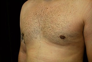 San Jose, California This is a 37 year old male who presents with adolescent gynecomastia to the San Francisco, California office for male breast reduction with gland excision and suction assisted lipectomy of his chest and the axilla or arm pit area. He is 6 feet 1 inch, 213 pounds. He lost approximately 50 pounds. He underwent surgery at Marin Cosmetic Surgery Center in Novato, California. He had 40 grams removed from his right chest and 45 grams removed from his left chest. His photographs are seen about six weeks after surgery.