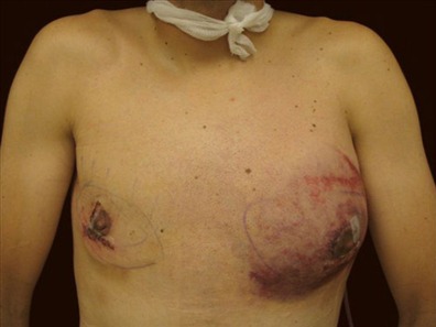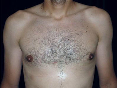 This is a 38-year-old resident of Oakland, California who presented to the San Francisco office at Union Square for evaluation for gynecomastia. He is 5 feet 11 inches tall and weighs 214 pounds. He has had previous gynecomastia surgery in year 2000 with liposuction only. He is not happy with the outcome and, therefore, presented to my office for further evaluation. His goal is to be able to wear a T-shirt and feel comfortable. He underwent gland excision and suction-assisted lipectomy at Marin Cosmetic Surgery Center in Marin County, California. He had 49 grams removed from his right side and 44 grams removed from his left. In addition, he had 600 cc of fat liposuctioned from his right side and 500 cc from his left. These photographs are seen six months after surgery. Note this is a common reason for revisional surgery, in which patients have liposuction only as their treatment. Thirty to thirty-five percent of my practice is redo surgery from other physician practices and the primary reason is due to liposuction only. This does not remove the glandular tissue.