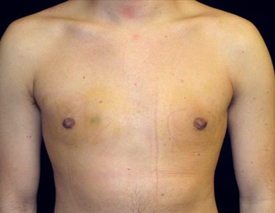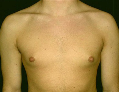 This is a 19-year-old resident of St. Louis, Missouri who presented to the San Francisco office at Union Square for evaluation for gynecomastia. He is 6 feet tall and weighs 185 pounds. His complaint is the puffy nipples, which causes him severe embarrassment. He underwent gland excision and suction-assisted lipectomy at Marin Cosmetic Surgery Center in Marin County, California. He underwent excision of 5 centimeters of tissue from his right side and 5 centimeters from his left. In addition, he had 125 cc of fat extracted from his right side and 150 from his left. The photographs are taken eight days after surgery since he is from St. Louis.