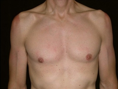 This 42-year-old man is 511 and 175lbs. He initially had gynecomastia surgery in 1978 with another surgeon, but was displeased with the outcome. I performed a secondary procedure on him, consisting of glandular excision and suction-assisted lipectomy of his chest, abdomen and flanks. I removed a total of 3750cc of fat bilaterally.
