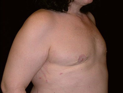 This 46-year-old man developed gynecomastia during adolescence. He underwent ultrasonic liposuction of the chest and axillae, from which I extracted a total of 650cc of fat from the right side of his chest and 700cc from the left. I also excised a total of 115 grams from the right and 135 grams from the left.