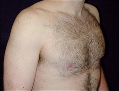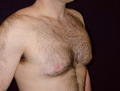 This 26-year-old man suffers from adolescent gynecomastia. He underwent glandular excision and suction-assisted lipectomy of the chest, with a total fat extraction of 500cc from the right side and 450cc from the left. Total glandular tissue removed was 17 grams from the right side and 14 grams from the left.