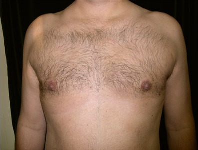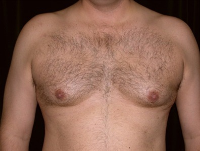 This 44-year-old man suffers from adolescent gynecomastia, and has stated that it was possibly due to steroid use as a child to treat his asthma. He underwent glandular excision and suction-assisted lipectomy of the chest, from which I removed a total of 900cc from the right and 925cc from the left. I also removed a total of 39 grams of glandular tissue from the right and 57 grams from the left. He had a revision surgery at 11 months post-op due to a slight depression on the right lower chest area.