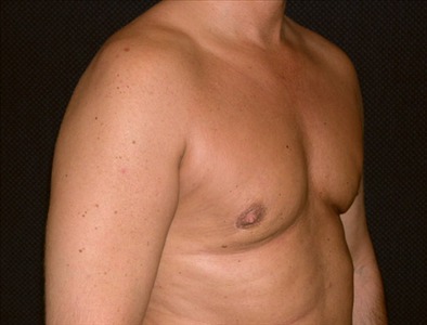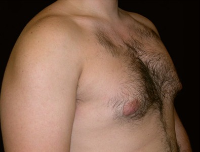 This 24-year-old man is 61 and 230lbs. He suffers from adolescent gynecomastia, which has caused him a great deal of embarrassment and self-consciousness about his chest. He underwent glandular excision and suction-assisted lipectomy of the chest, from which I extracted a total of 325cc of fat from the right and 700cc from the left. His goal was to reduce/eliminate my psychological and physical discomfort.