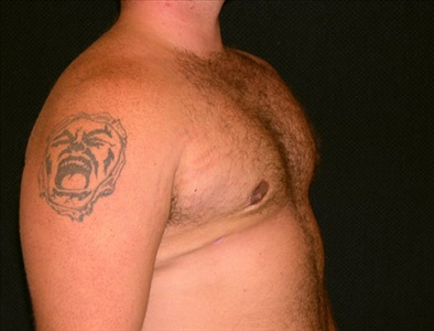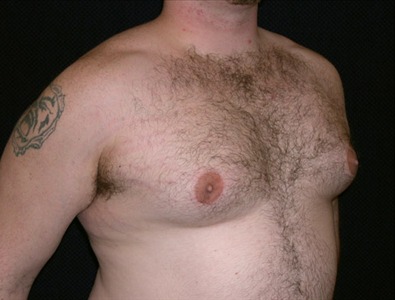 This 24-year-old man suffers from adolescent gynecomastia, which has caused him extreme embarrassment over the years. He underwent glandular excision and suction-assisted lipectomy of the chest and axillae. He opted to have axillary liposuction to extract the fat along the bottom portion of the axillae and produce a more even result.