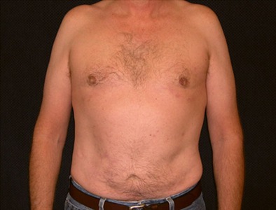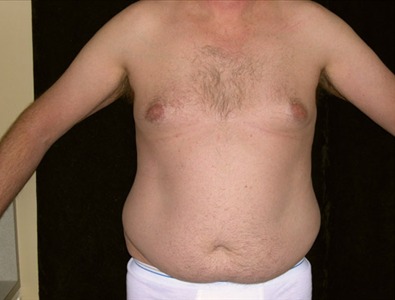 This 55-year-old man suffers from adolescent gynecomastia. He underwent glandular excision and suction-assisted lipectomy of his chest, flanks and abdomen. From the right flank, I removed 1325cc of total fat, 1175cc from the left flank, 2650cc from the abdomen, 475cc from the right side of the chest and 450cc from the left side, bringing the total amount of fat removed to 6075cc.