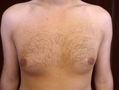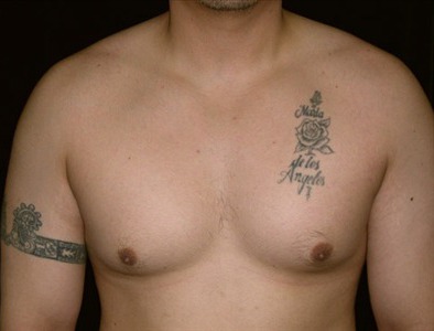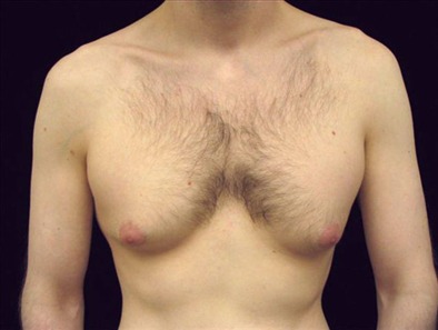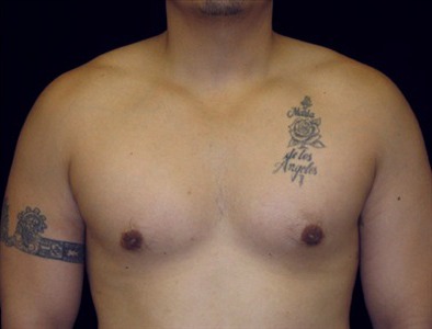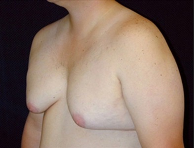 This 29-year-old man is 57 and 180lbs. He suffers from adolescent gynecomastia. He underwent glandular excision and suction-assisted lipectomy , from which I removed a total of 1000cc of fat from each side of the chest. I also excised a total of 14 grams of glandular tissue from the right side and 23 grams from the left. His goal was to have a more masculine-looking chest.