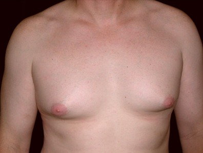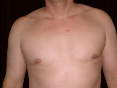 This 36-year-old man is 6 and 218lbs. He suffers from adolescent gynecomastia which has caused him severe embarrassment over the years. He underwent glandular excision and suction-assisted lipectomy, from which I removed a total of 700cc of fat from the right side of the chest and 400cc from the left. I also excised a total of 16 grams of glandular tissue from the right and 38 grams from the left. His goal was to achieve the best possible result.