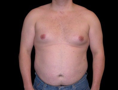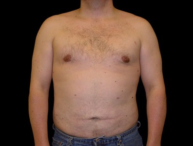 This 33-year-old man is 510 and 250lbs. He developed adolescent gynecomastia and never was able to expose his chest due to severe discomfort. He underwent glandular excision as well as ultrasonic liposuction of the abdomen, flanks and axillae, from which I extracted a total of approximately 8000cc of fat. His goal was to feel comfortable in a T-shirt.