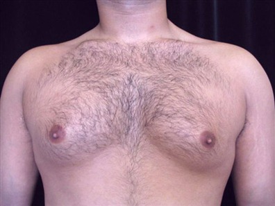HISTORY: This is a 25-year-old male resident of Berkley, California who presents to the San Francisco, California office for evaluation for gynecomastia. In addition he wishes liposuction of the abdomen and flanks. He has adolescent gynecomastia. He feels comfortable with his body and able to take off his shirt in public although a bit reserved. His goal is to have a well defined chest with no excess fat. He underwent gynecomastia breast gland excision and chest liposuction. He had ultrasound liposuction of the abdomen and flanks. He had 325 cc of fat extracted from his right flank and 375 extracted from his left. He underwent liposuction of his chest with extraction of 100 cc of fat from each side. He had 44 grams of tissue excised from his right breast and 24 grams excised from his left. His surgery was performed at Marin Cosmetic Surgery Center in Marin County, California. His photographs were taken three months after surgery.