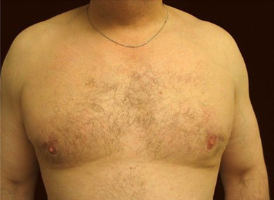HISTORY: This is a 52-year-old resident of Folsom, California who has had gynecomastia surgery in 2003. His gynecomastia surgery procedure was liposuction only. He presents to the San Francisco office for improvement in his chest shape. He does not take off his shirt in public due to embarrassment and his goal is to acquire a flat contoured chest. He underwent revision gynecomastia surgery with gland excision and suction assisted lipectomy of the chest and the axilla. He underwent 400 cc of fat excised from both the left and the right axilla and liposuction approximately 200 cc from his chest on each side.He had 41 grams excised from his right side and 78 grams from his left side. His surgery was performed at Marin Cosmetic Surgery Center in Marin County, California. His photographs are seen 3 months after surgery.