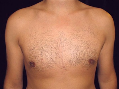 HISTORY: This is a 28-year-old resident of San Francisco, California who presents to the San Francisco office for evaluation of gynecomastia. He has male breast enlargement from a very early age of about 10 years old, therefore, adolescent gynecomastia. He does not take off his shirt in public due to the embarrassment. He underwent gland excision and suction assisted lipectomy at Marin Cosmetic Surgery Center in Marin County, California in which he had 250 cc of fat aspirated from each chest through a periareolar incision. His photographs were taken 4 months after surgery.
