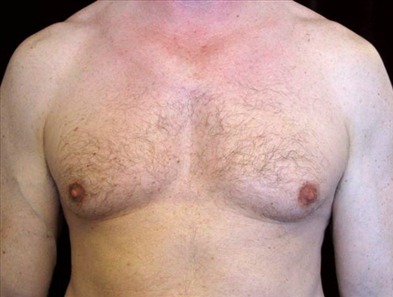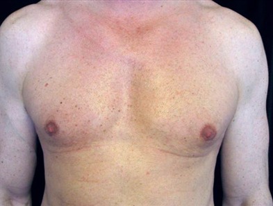 HISTORY: This is a pleasant 45-year-old man from Mineral Park, California who presents to the San Francisco office with gynecomastia. He has had a previous gynecomastia surgery for steroid induced gyneomastia. His goal is to have a flatter chest. He underwent gland excision and suction assisted lipectomy at Marin Cosmetic Surgery Center in Marin County, California. He had his first procedure in 2009 in which he had approximately 300 cc of fat extracted from each side. At that time he had a 4.5 cm section of tissue excised from his right side and 4.5 cm tissue of tissue removed from his left side. He continued to take steroids and developed a recurrence of his steroid induced gynecomastia. He underwent an additional procedure of gland excision over one year later. At that time he had 35 grams of tissue removed from his left breast and 3.5 grams of tissue removed from his right breast. His postoperative photographs are seen approximately six months after surgery.