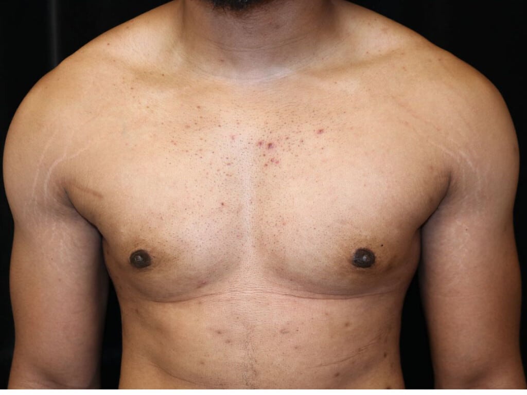 This is a 31 y.o. male 5 9 and 190 lb who underwent male breast reductions surgery for adolescent gynecomastia. He is seen 2 months after surgery.