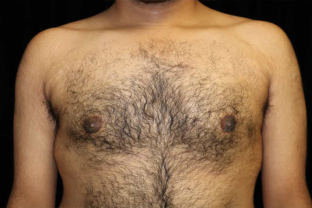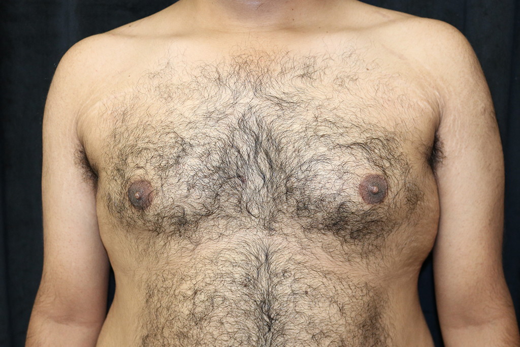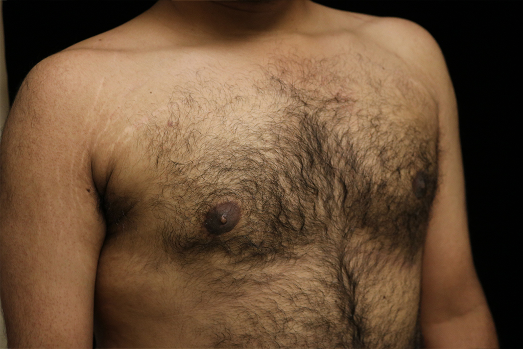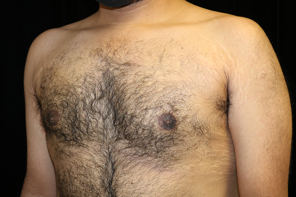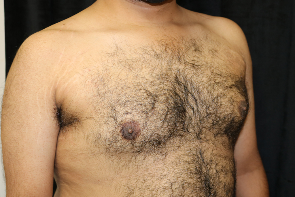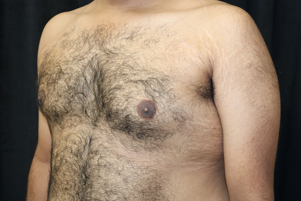This patient is a 25-year-old male who presents with adolescent gynecomastia with asymmetry of his chest and a large volume of fat in the left armpit area. He underwent male breast reduction surgery with gland excision and liposuction with axillary liposuction. The patient is turned side to side with the arm extended for thorough fat removal. His photos are seen approximately four months after surgery.