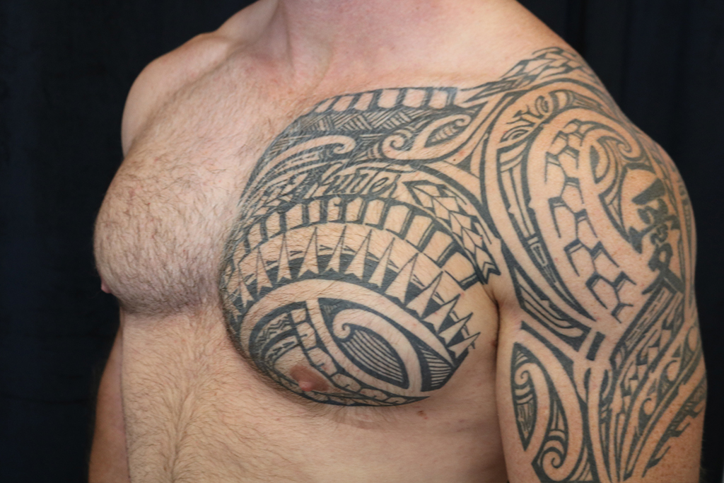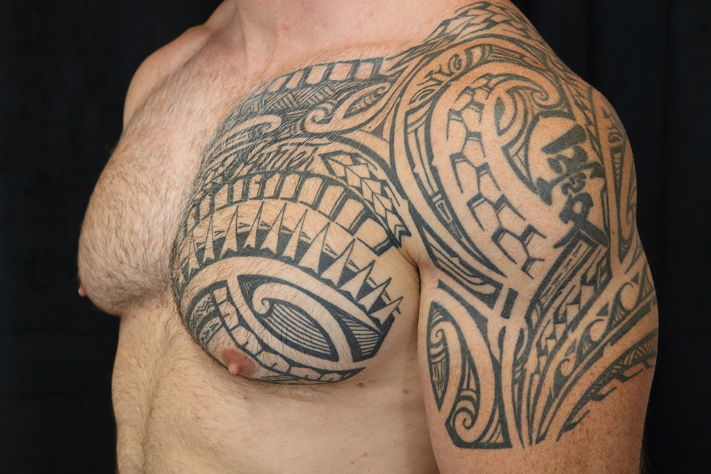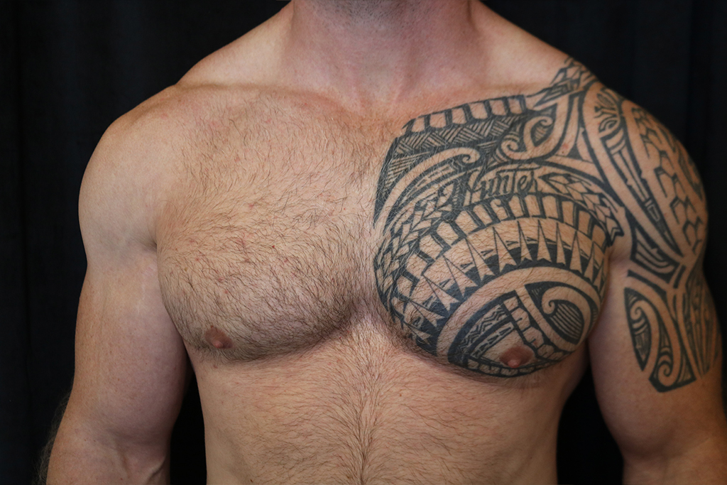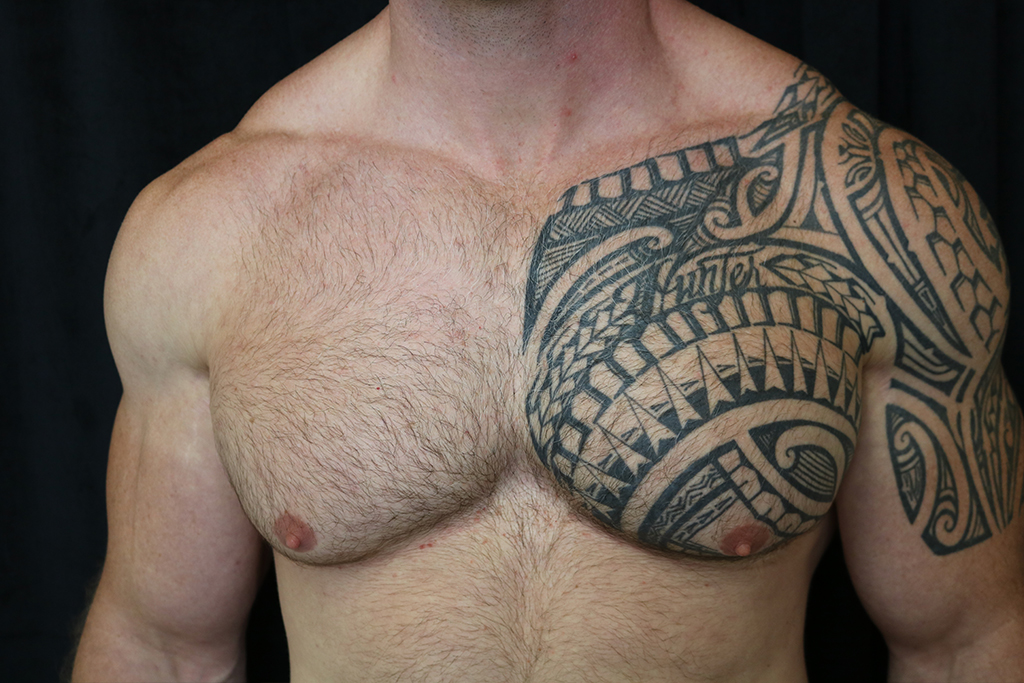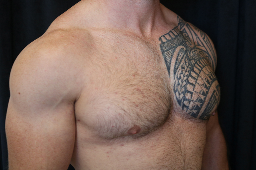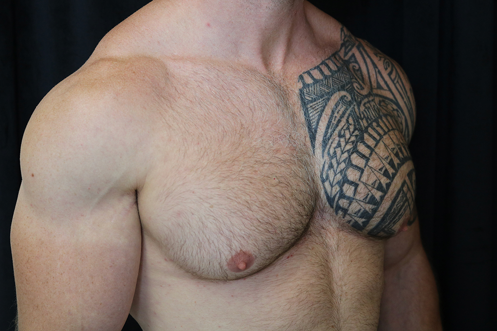 This patient is a 28-year-old male with grade 2 1/2 gynecomastia who underwent gland excision and liposuction. He is seen approximately three months after surgery. Note the chest contour defines the pectoralis muscle and well-healed incisions.