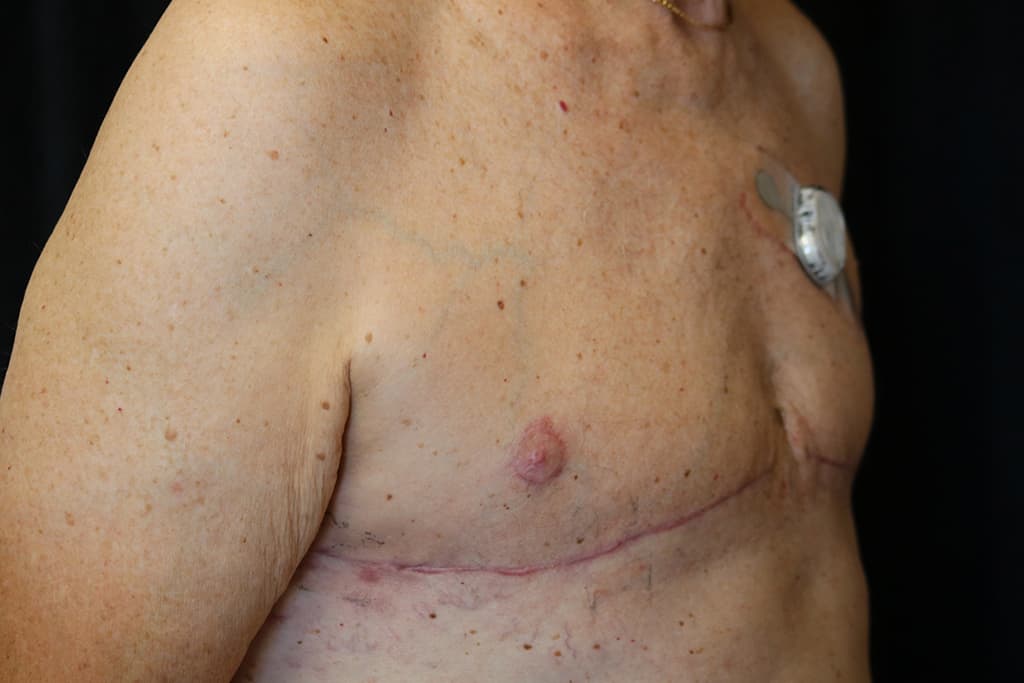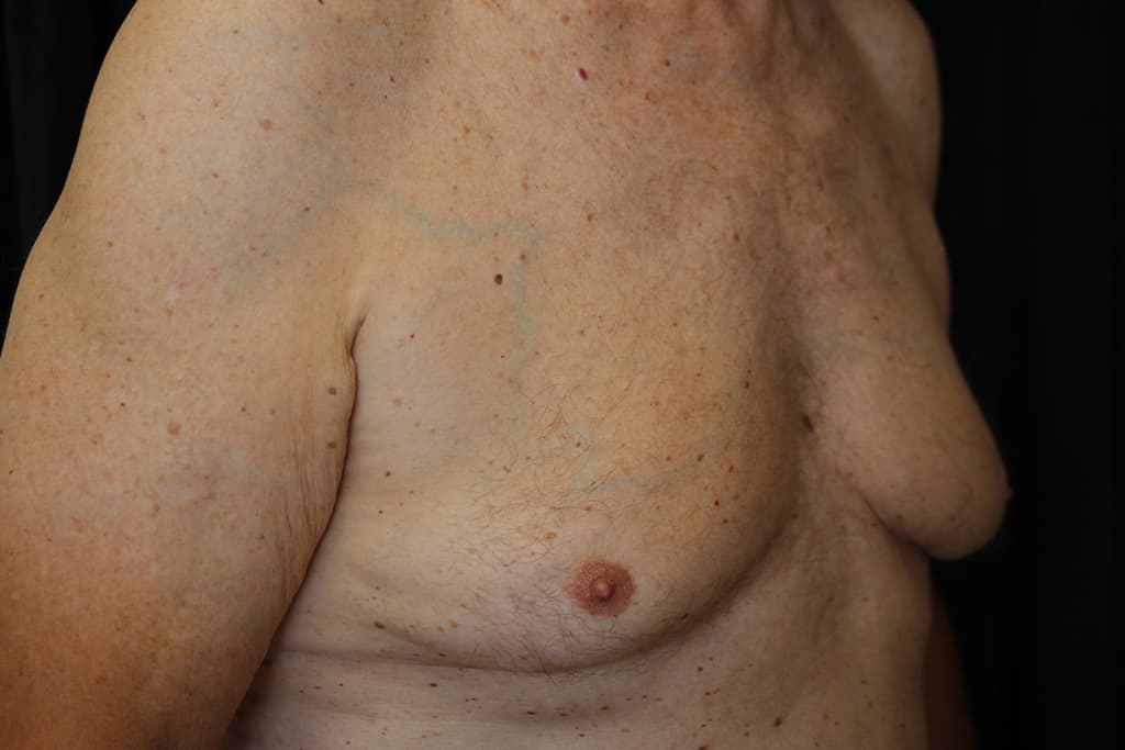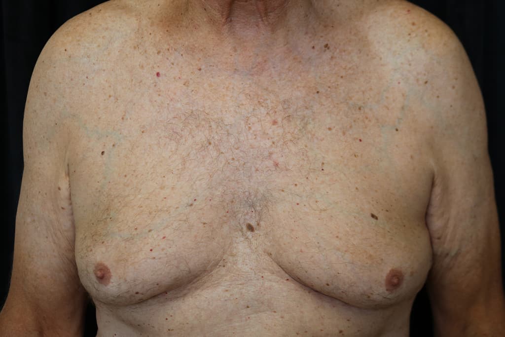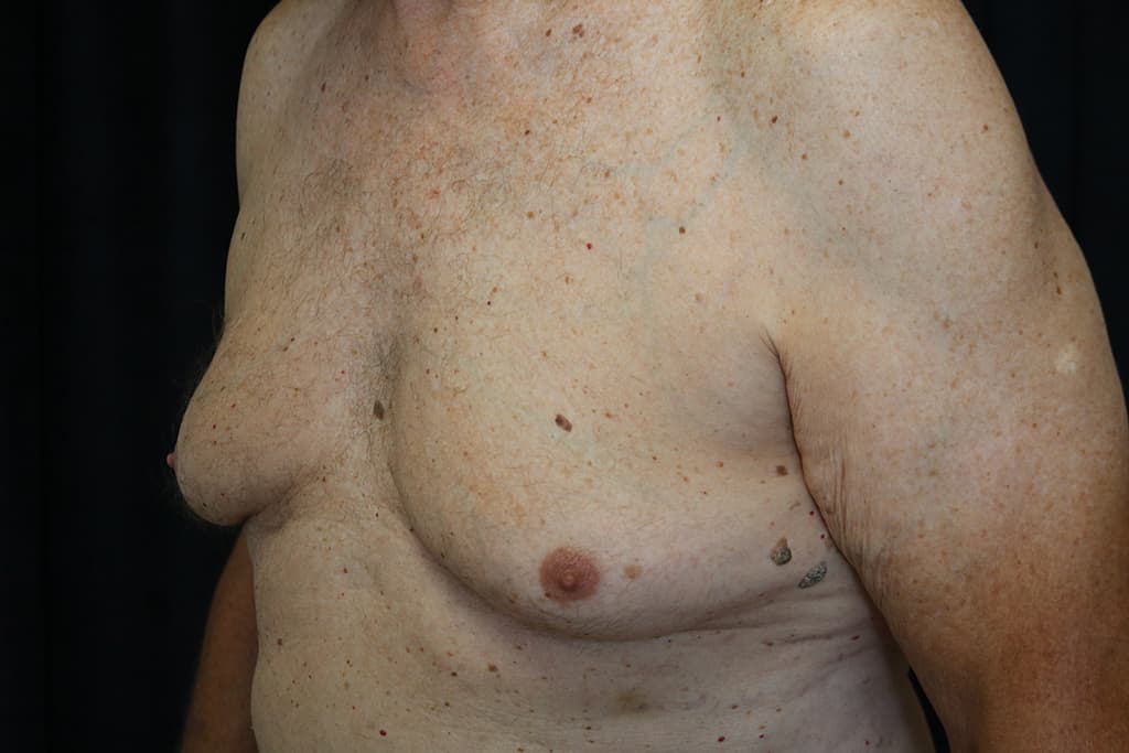 This patient is a 50-year-old male who presents with grade 4 gynecomastia and undergoes a free nipple double incision mastectomy (skin excision and nipple repositioning). He is seen approximately four months after surgery. His incisions are starting to fade.